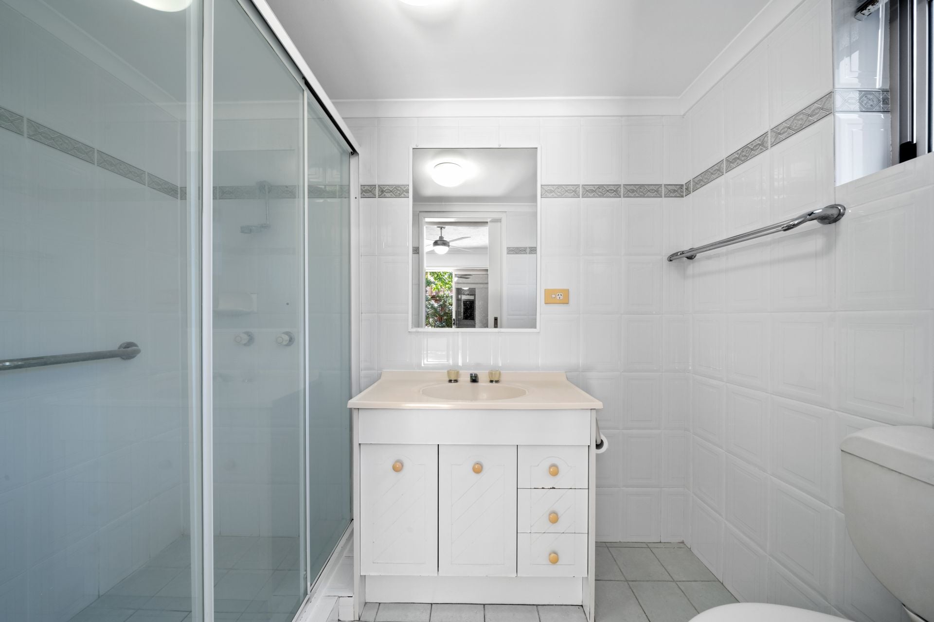 - Main bathroom features a shower over bath with glass shower screen, vanity with storage, & window with mirror, security screen & compact laundry with tub