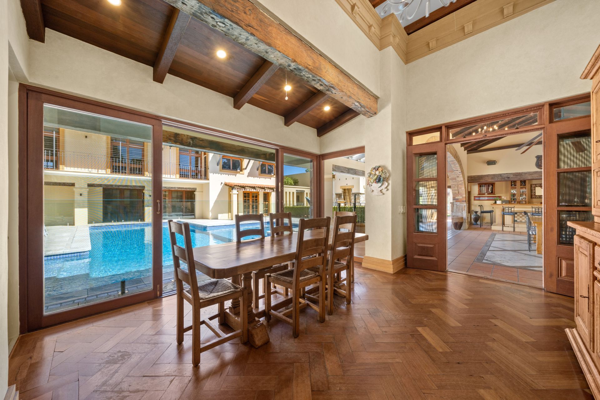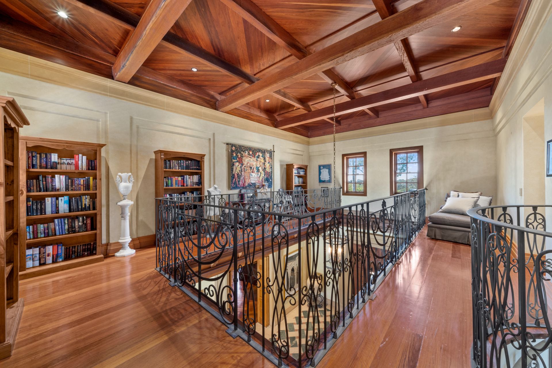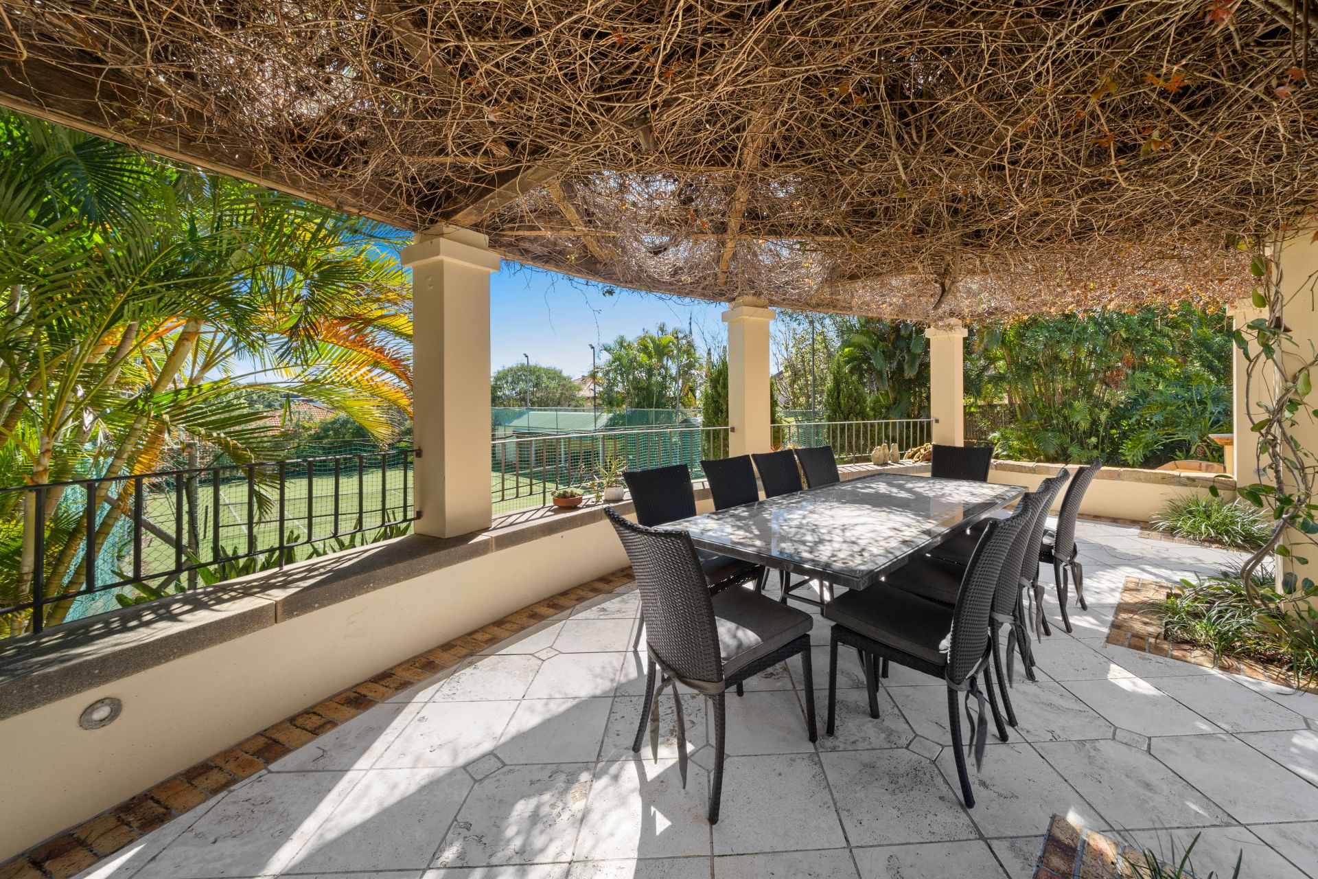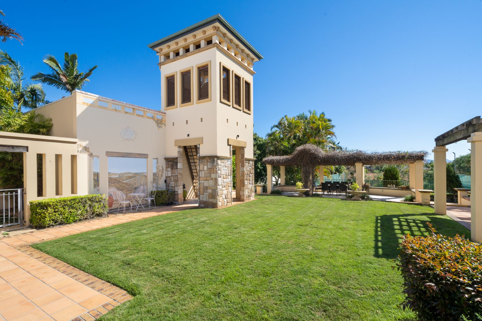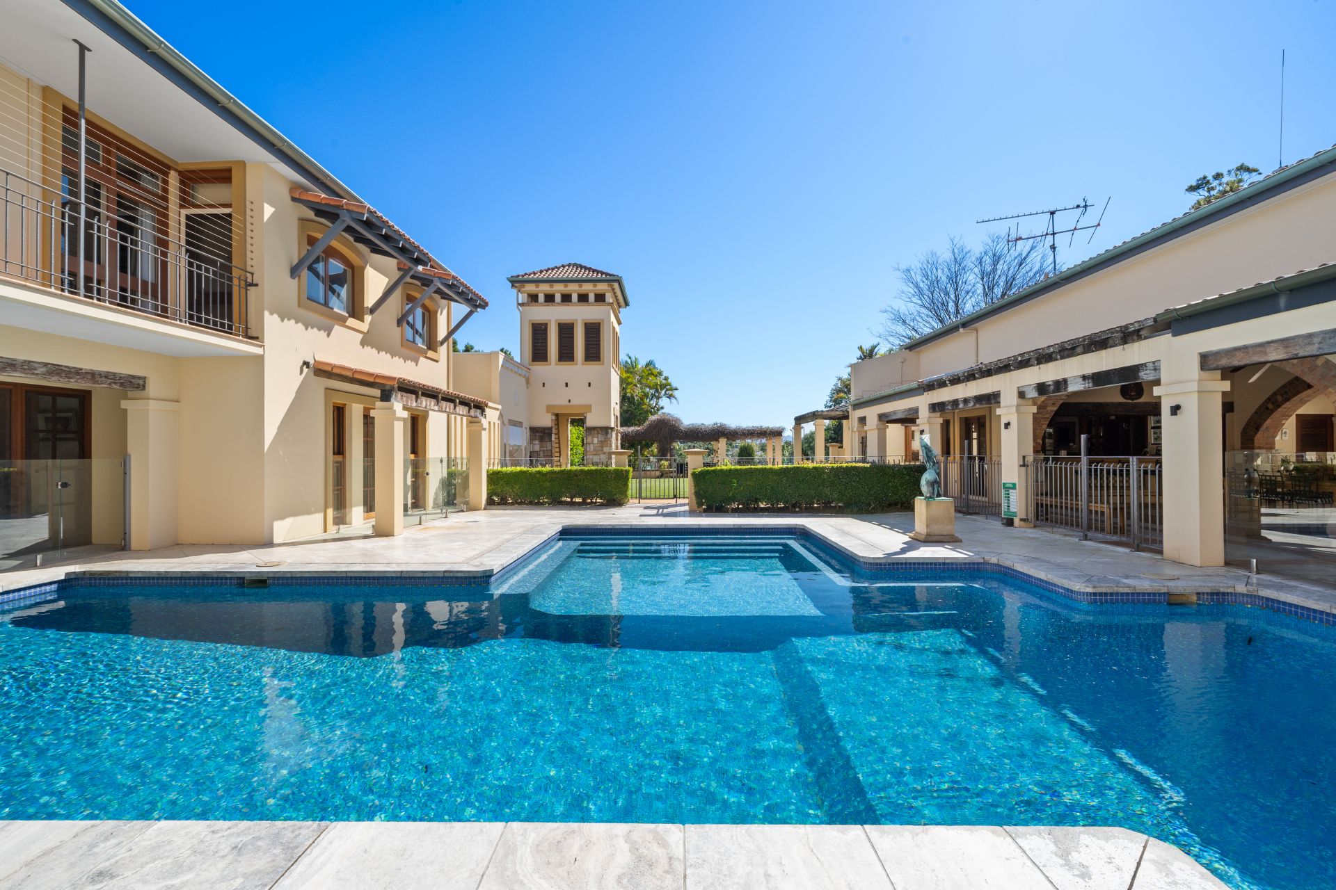 Without peer or rival this residence fuses Chelmstone, marble and reclaimed timbers from Newstead Wharf this home is as close to the Palazzo Versace in Brisbane that you will ever find – and you can call it home. Boasting a hilltop address with views to the ocean and resort like grounds including tennis court, gym, cold room, numerous outdoor entertainment areas, library and of course the palatial pool that the home encapsulates.