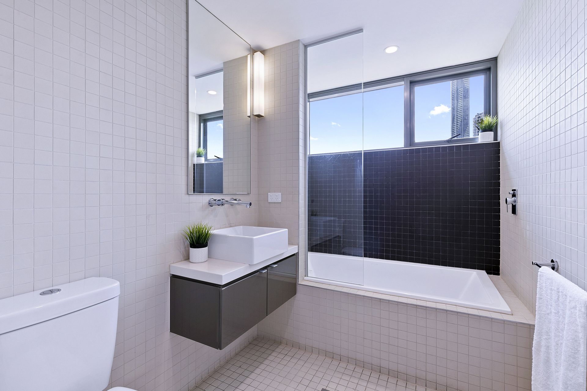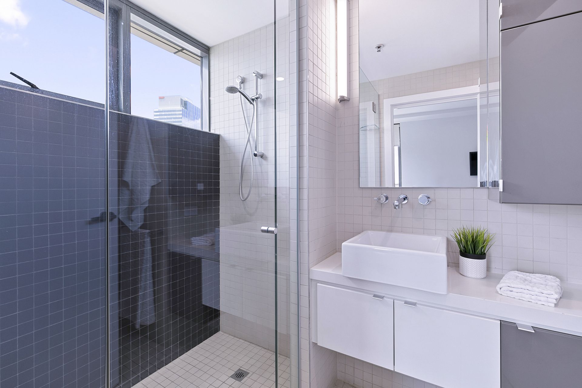 storage, stone bench-top, frame-less vanity mirror, towel rails, towel hooks,