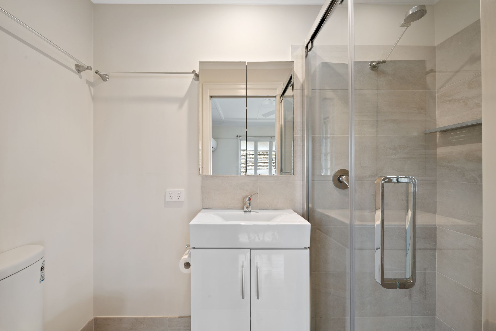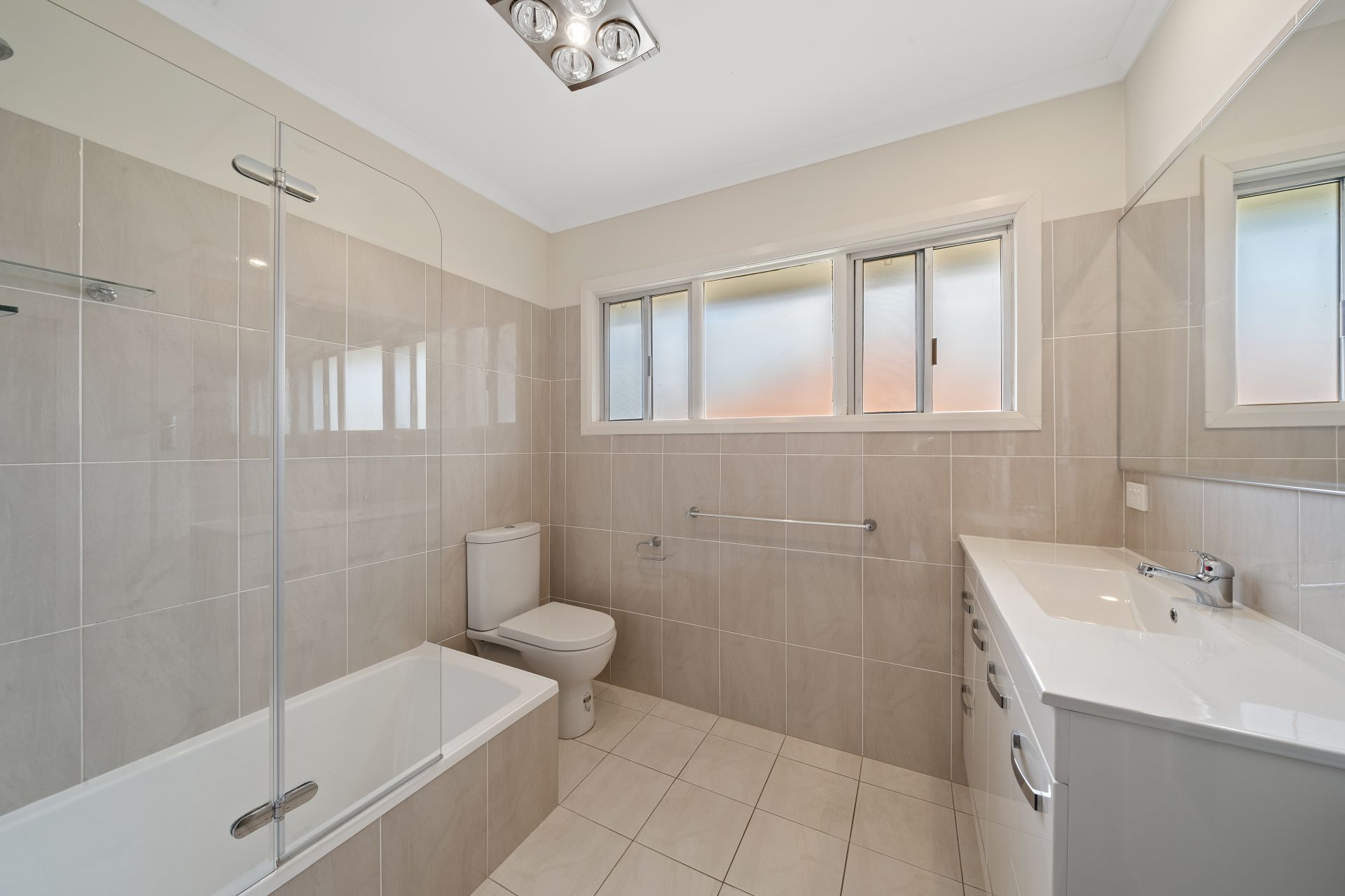 > The bathroom features a shower over bath configuration, single basin vanity with plenty of storage, frameless vanity mirror, over vanity lighting, exhaust/heat/light combo, frosted sliding windows, towel rails and toilet.