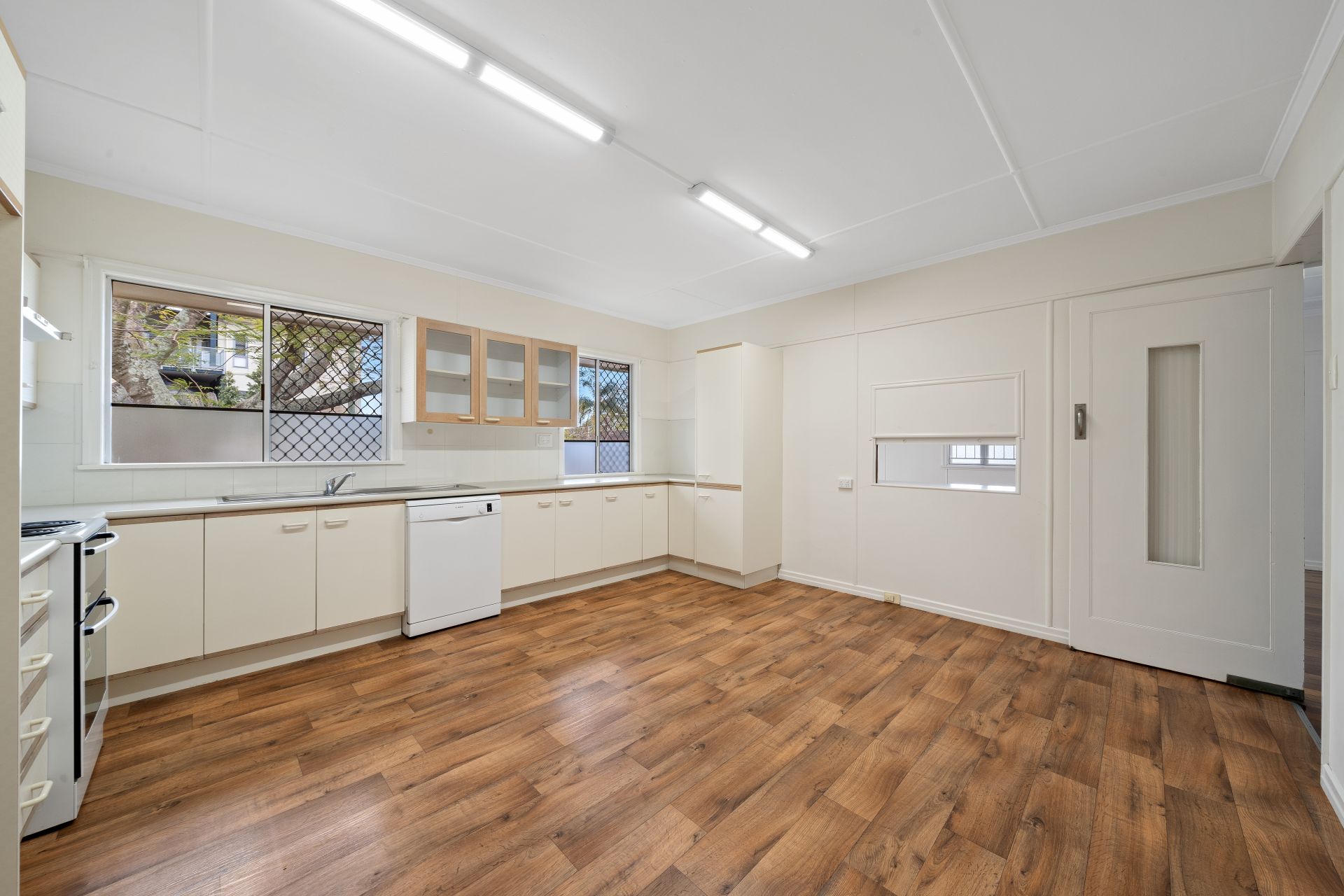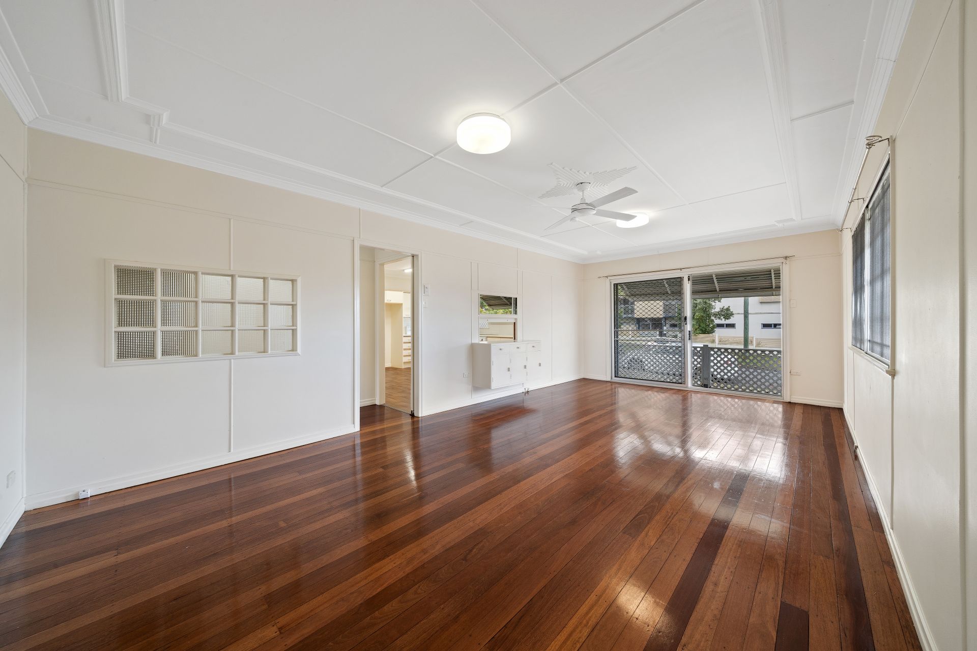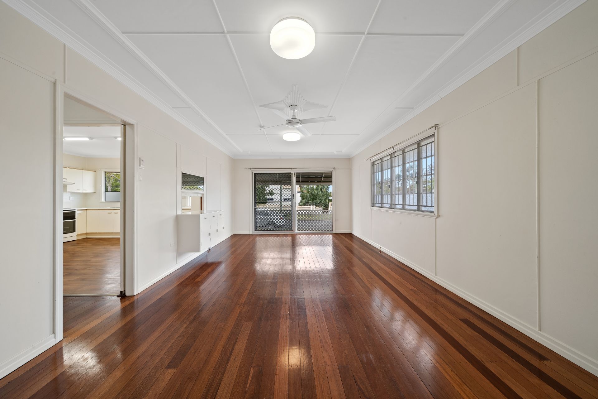 > The open lounge/dining area flows effortlessly to the kitchen/meals and out to the backyard. Featuring extra-high ceilings, ornate cornicing, rich timber flooring, casement windows, fly screens, ceiling fan, oyster lighting and large glass sliding doors giving you access to the balcony.