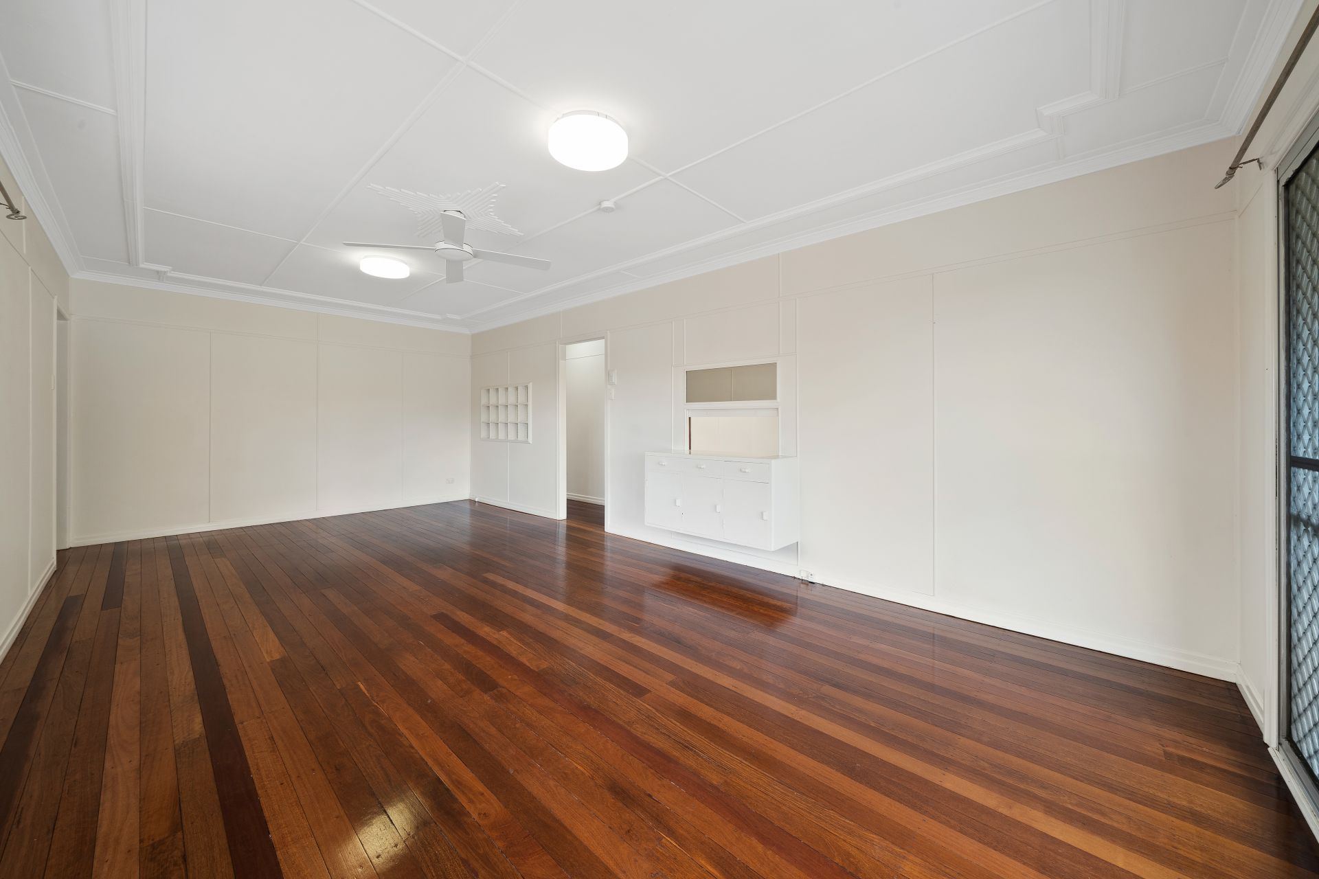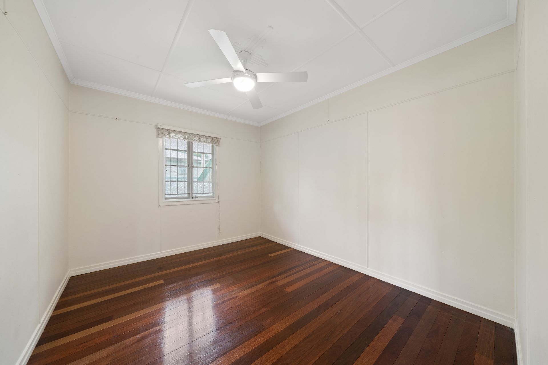 > Bedroom 3 features rich timber flooring, extra-high ceilings, ornate ceiling work, ceiling fan with lighting, casement windows, fly screens, security bars and venetian blinds.