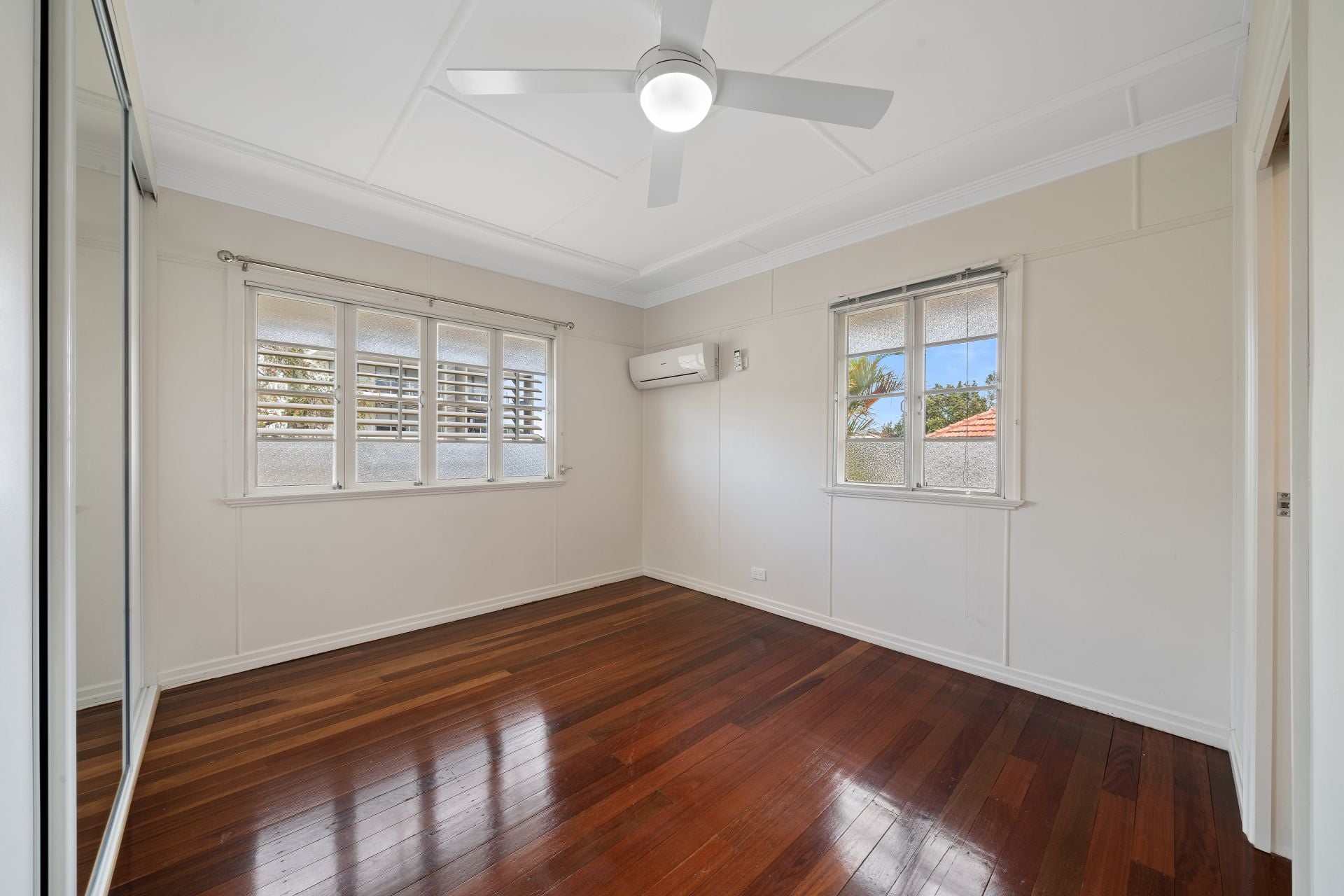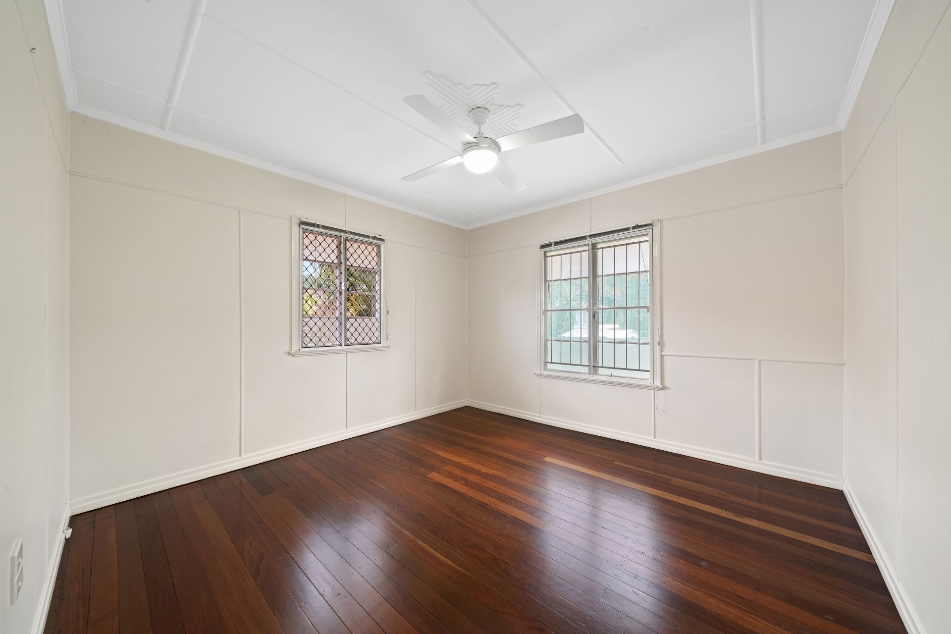 > Bedroom 2 features rich timber flooring, extra-high ceilings, ornate ceiling work, ceiling fan with lighting, casement windows, fly screens, security bars and venetian blinds.