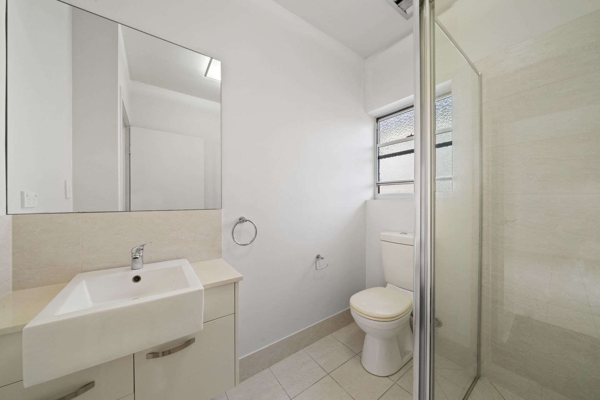 > The ensuite to bedroom one features a single basin floating vanity with plenty of storage, framed vanity mirror, shower with dual shower with detachable shower head and a toilet.