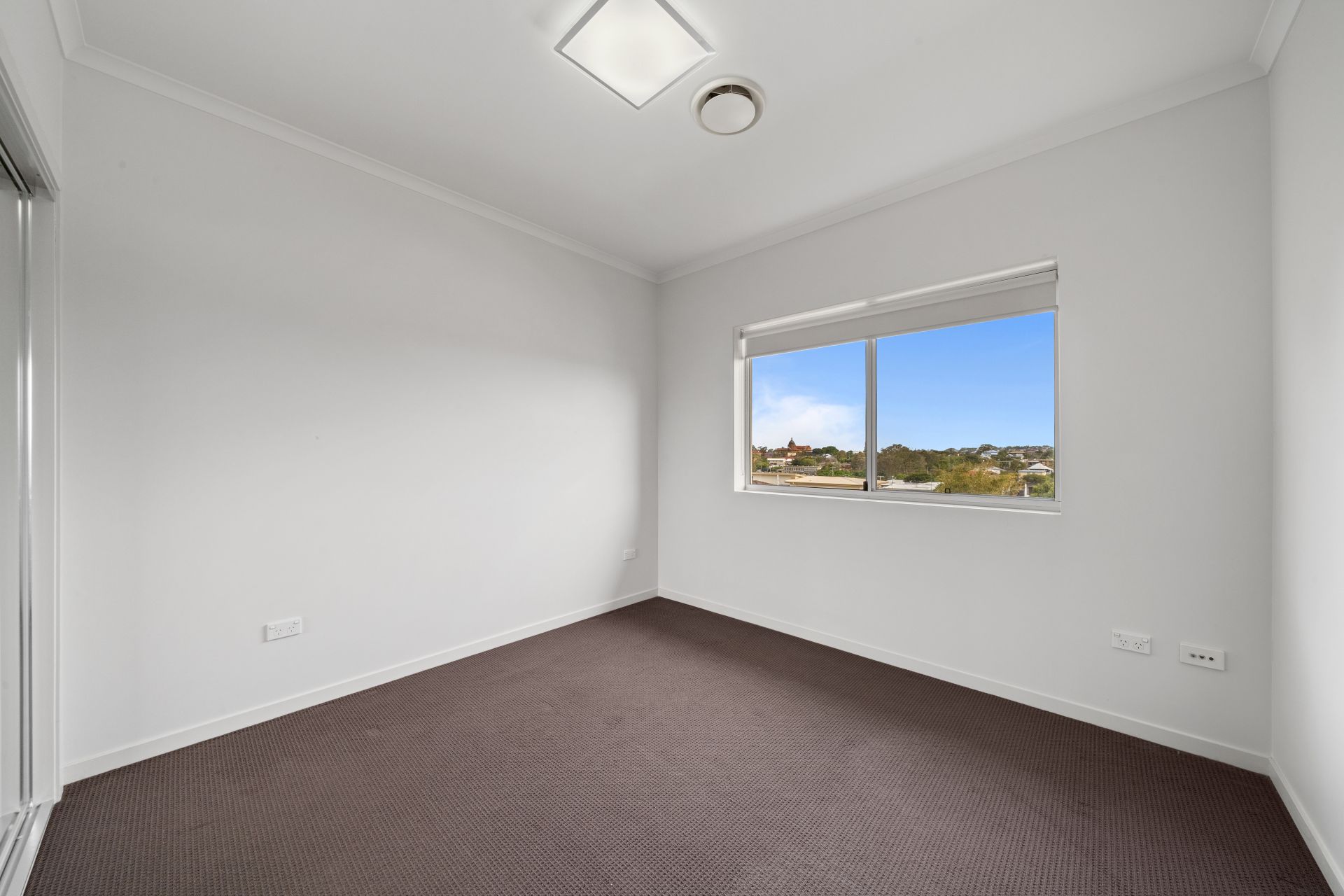 > The second bedroom features Mitsubishi ducted air-conditioning, carpet flooring, roller blinds, oyster lighting, sliding windows with security screens and built-in robes.