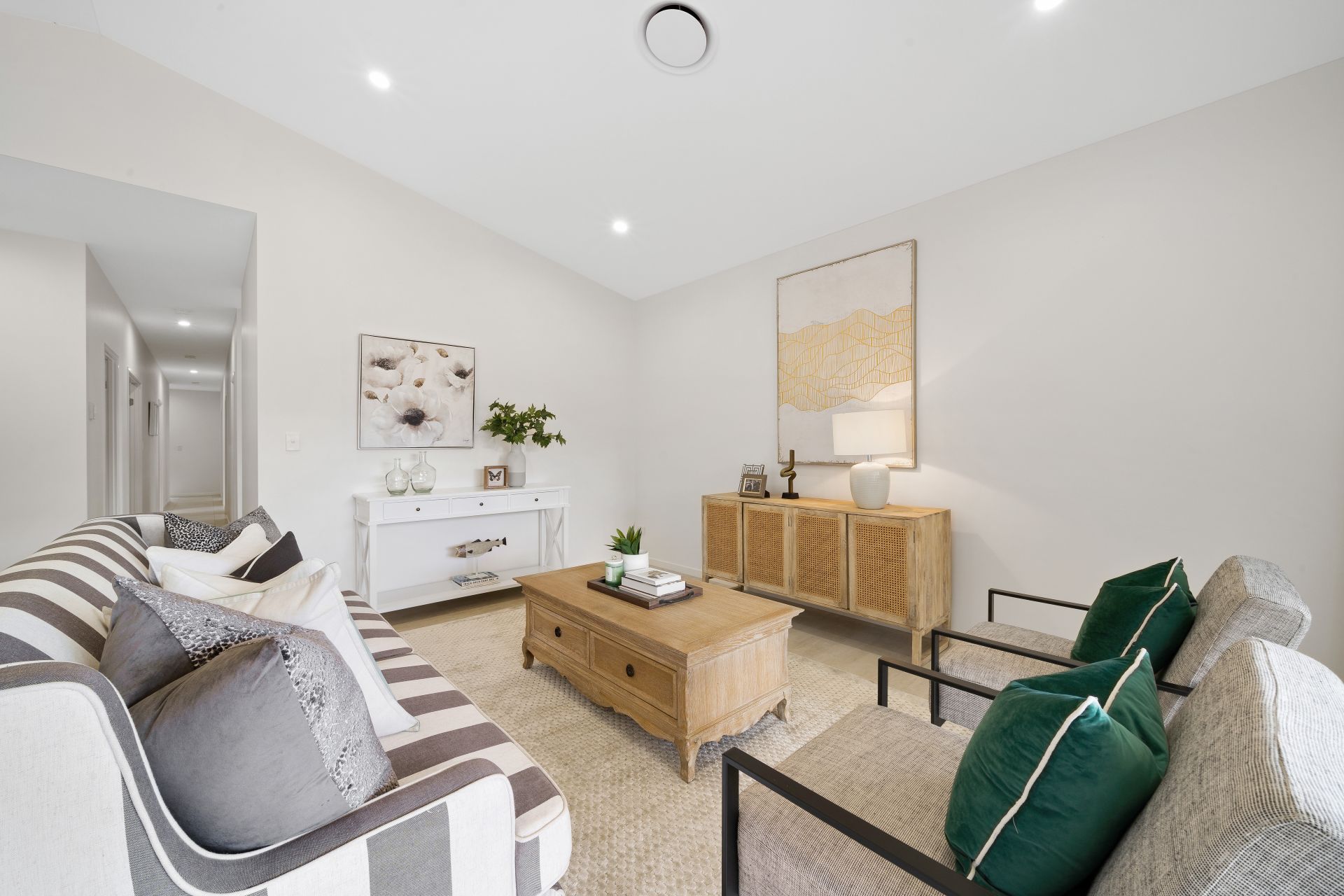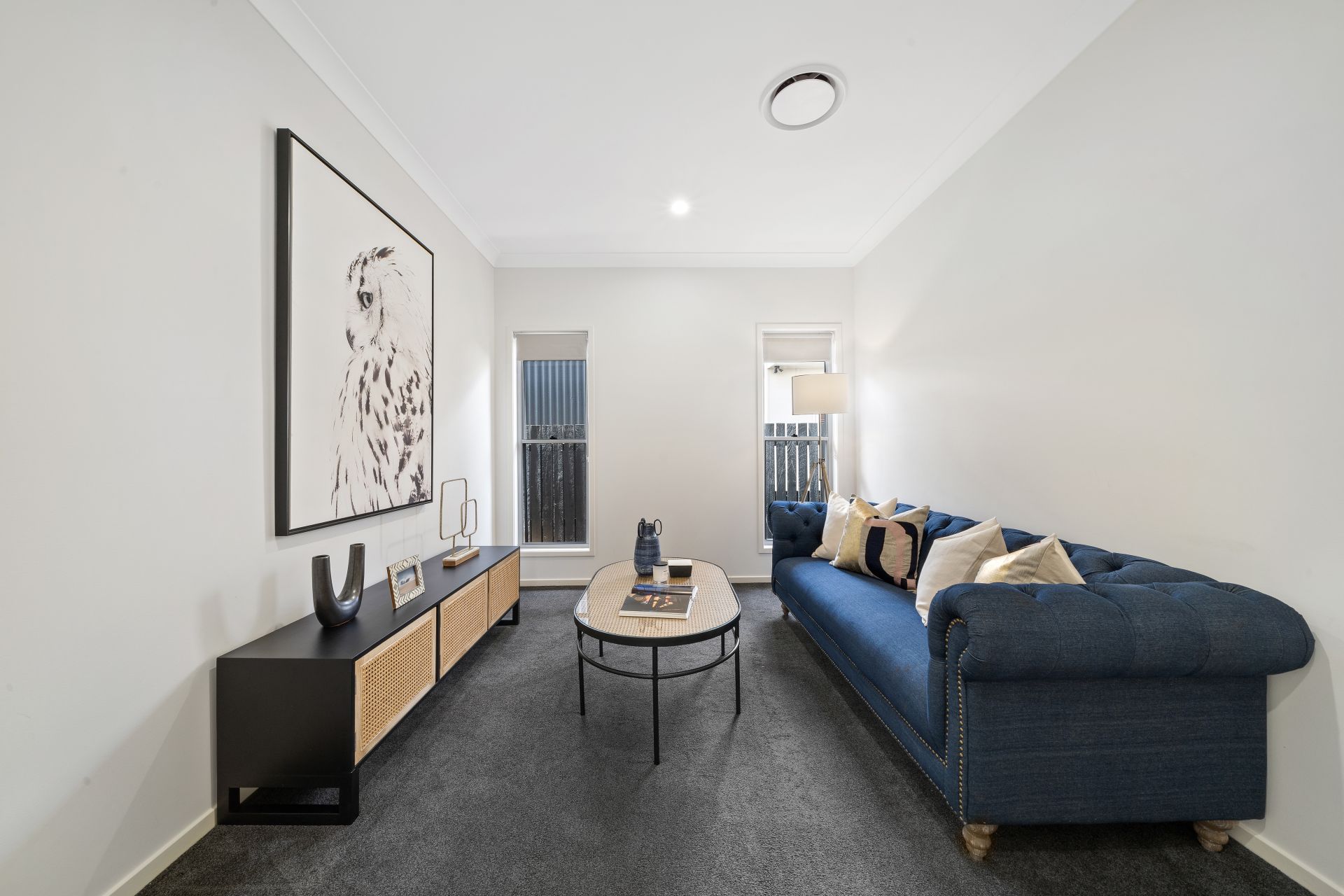 > The second living area located at the heart of the property features extra-high ceilings, sash windows allowing natural light into the room, roller blinds, carpet flooring, down lighting and access to the rest of the living areas.