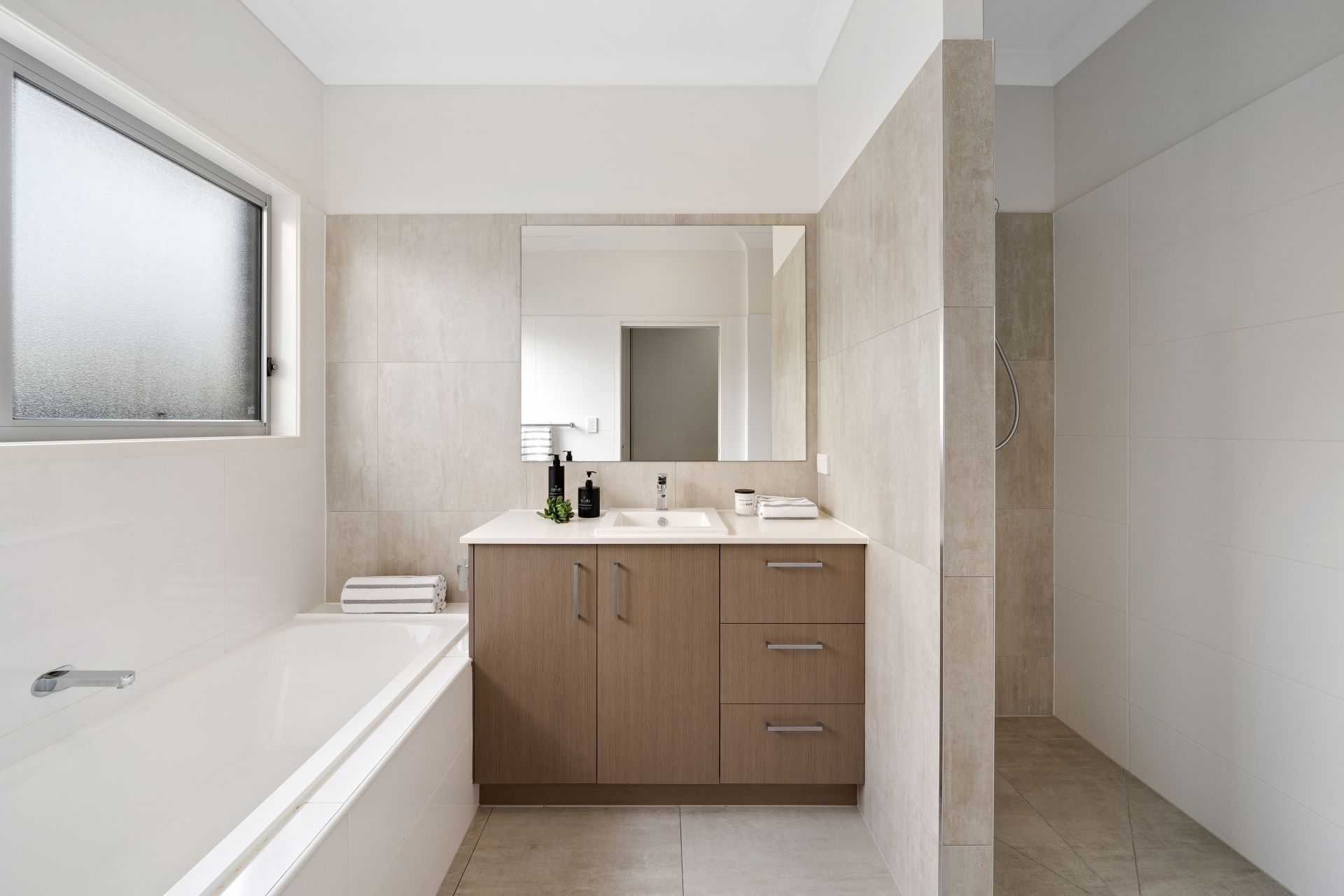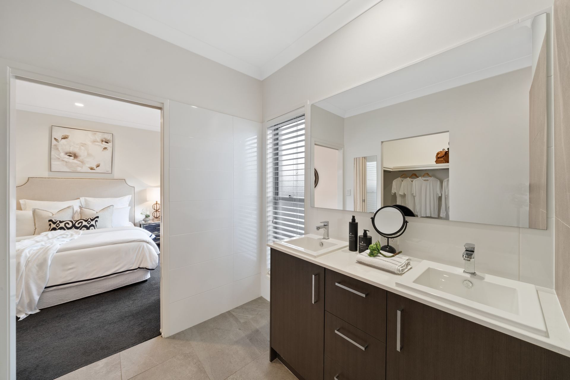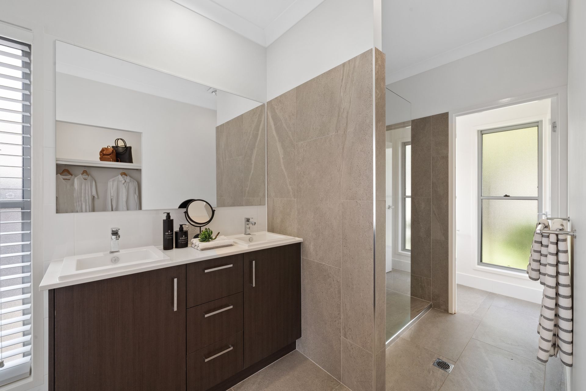 > The ensuite bathroom offers dual basin vanity with plenty of storage, large vanity mirror, shower with a detachable shower head, wall niche, towel rack light, heater/extractor/ light combo and separate toilet.