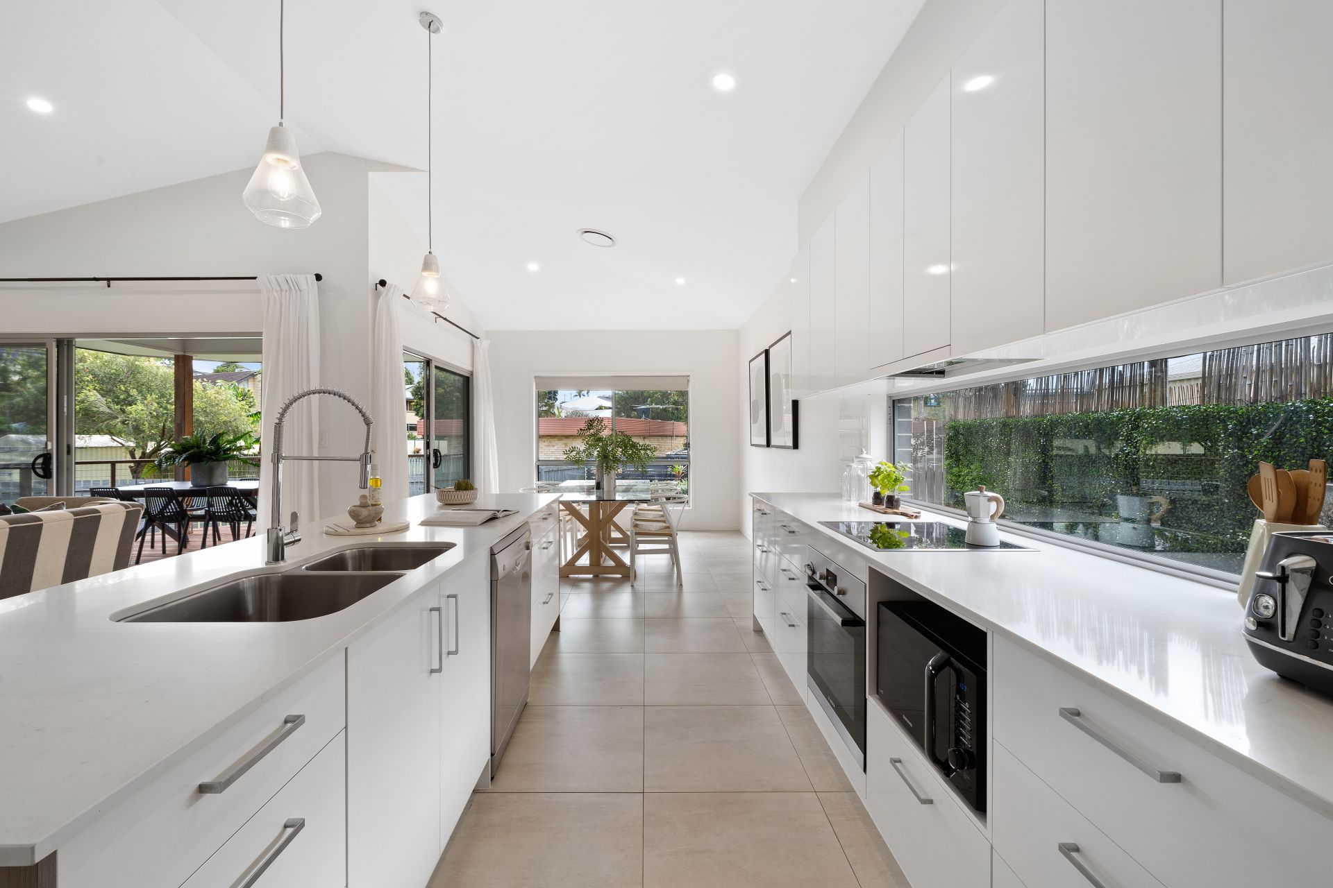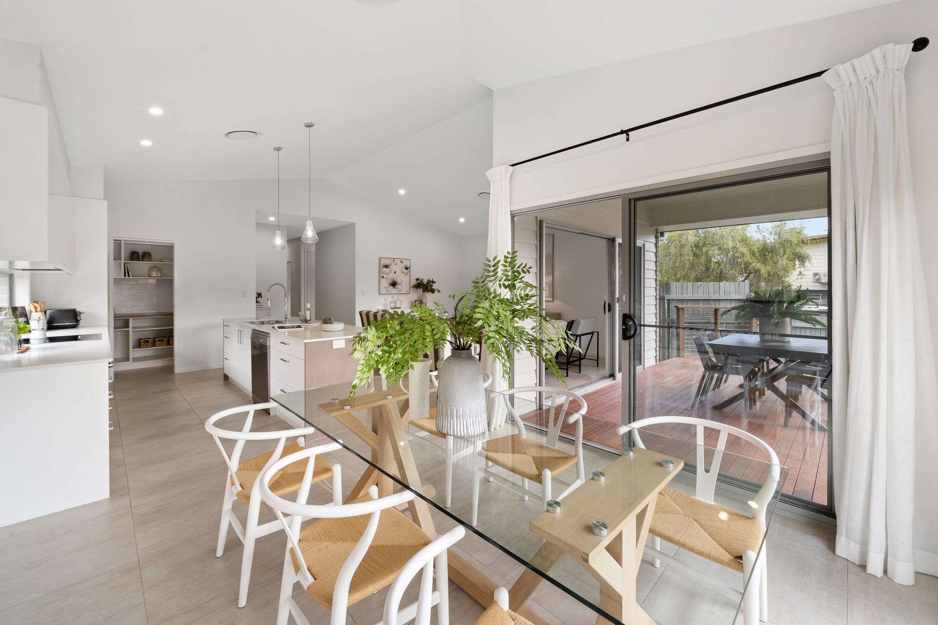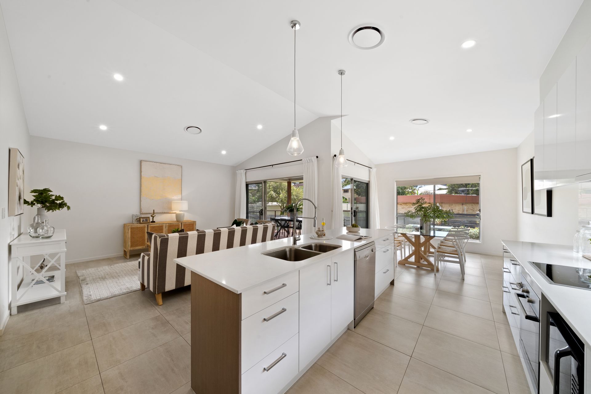 > The open plan main living/dining areas located at the heart of the home flow effortlessly to the kitchen and through to the outdoor entertaining area. The light and contemporary colour scheme plus the extra-high ceilings add to the expansive nature of the home, boasting Fujitsu ducted air-conditioning, down-lighting, tiled flooring, sliding windows and a bank of glass sliding doors giving you access to the rear deck and yard.
