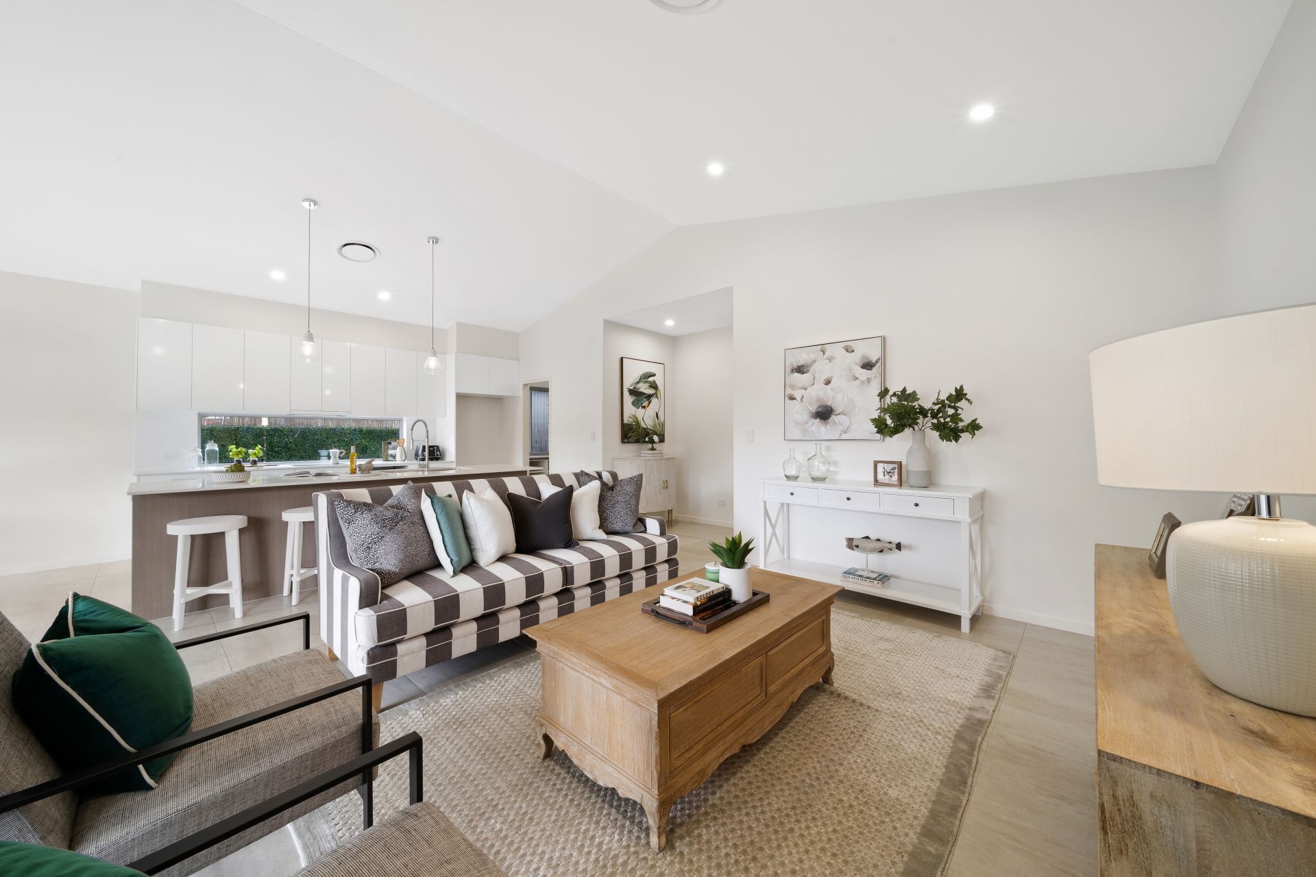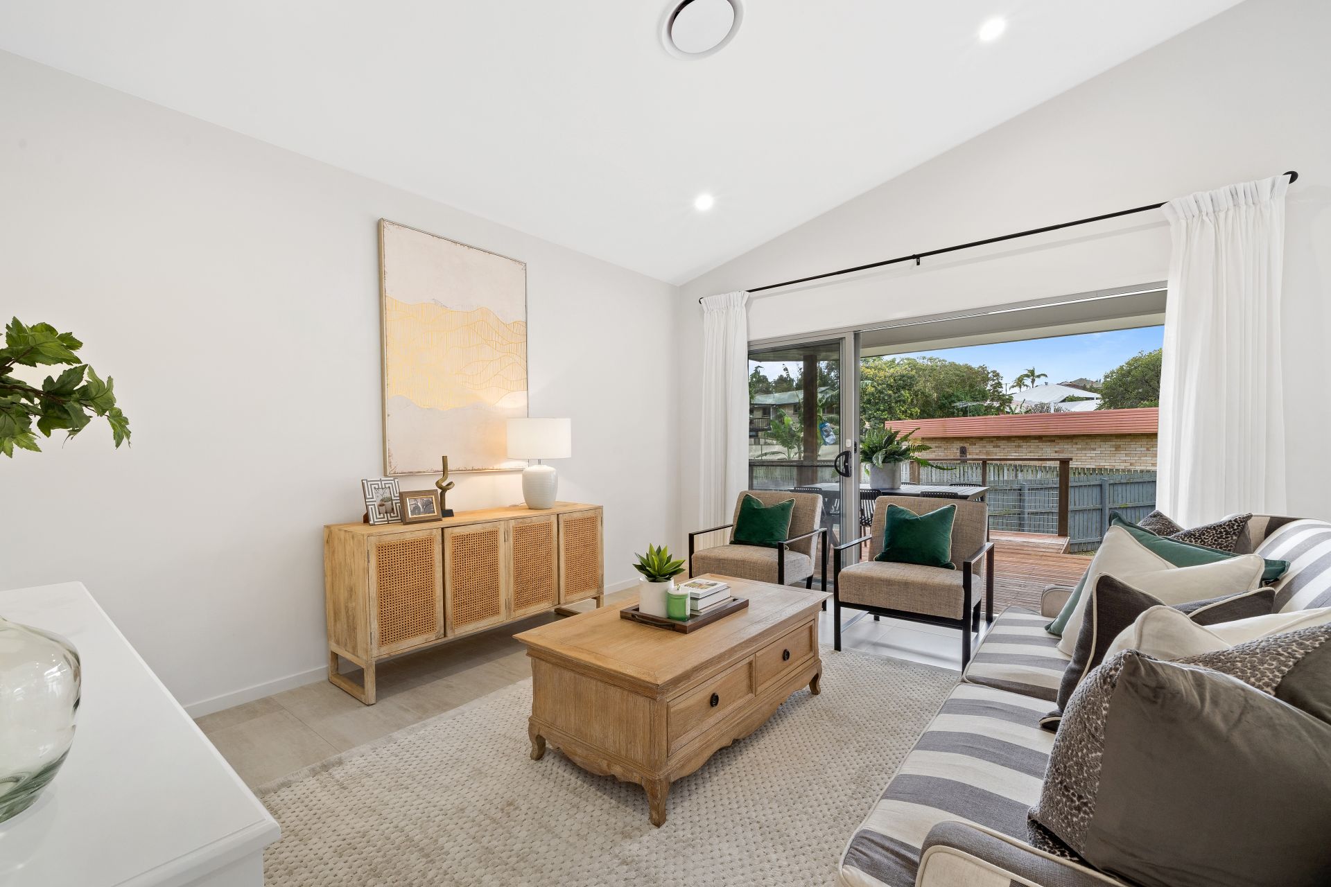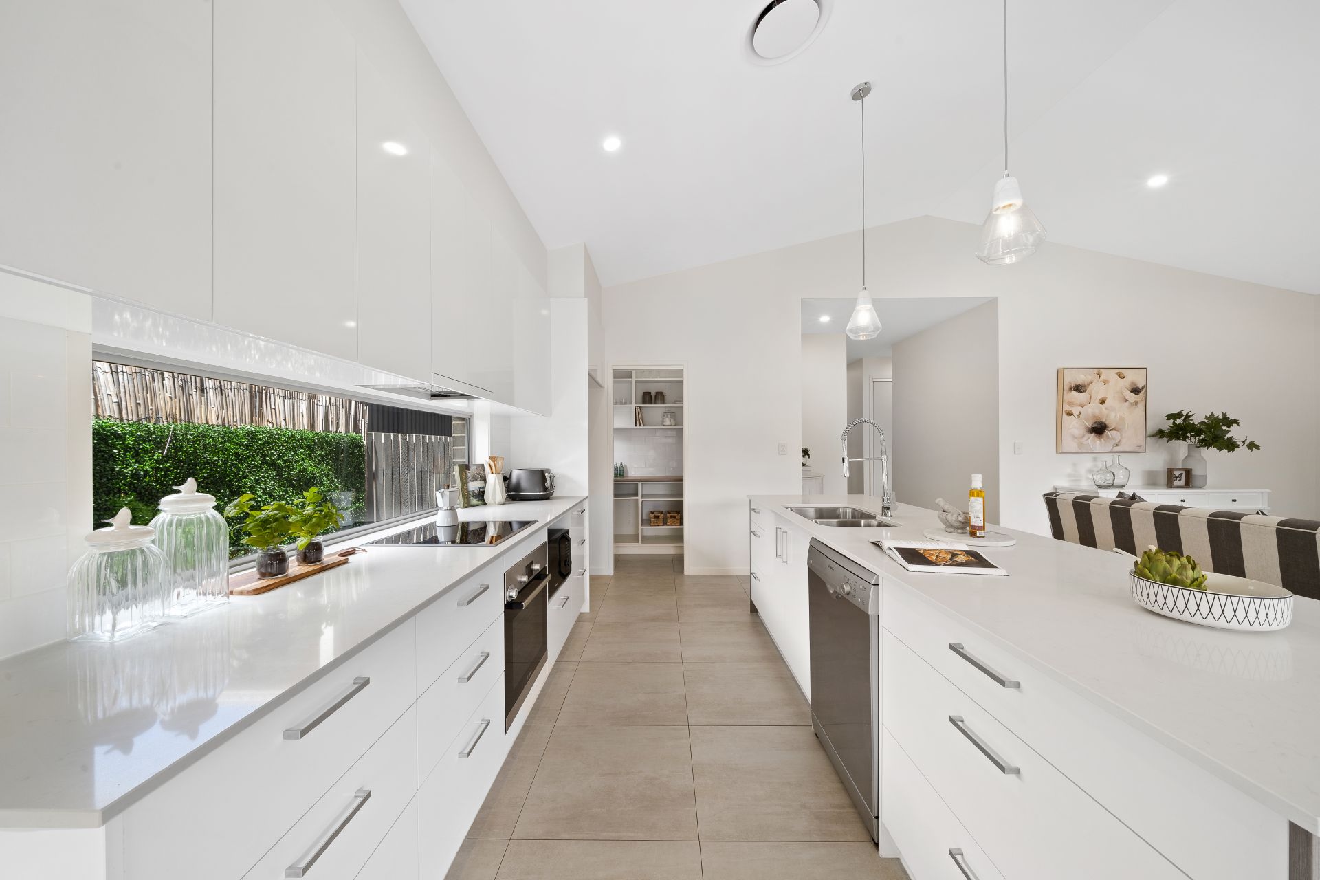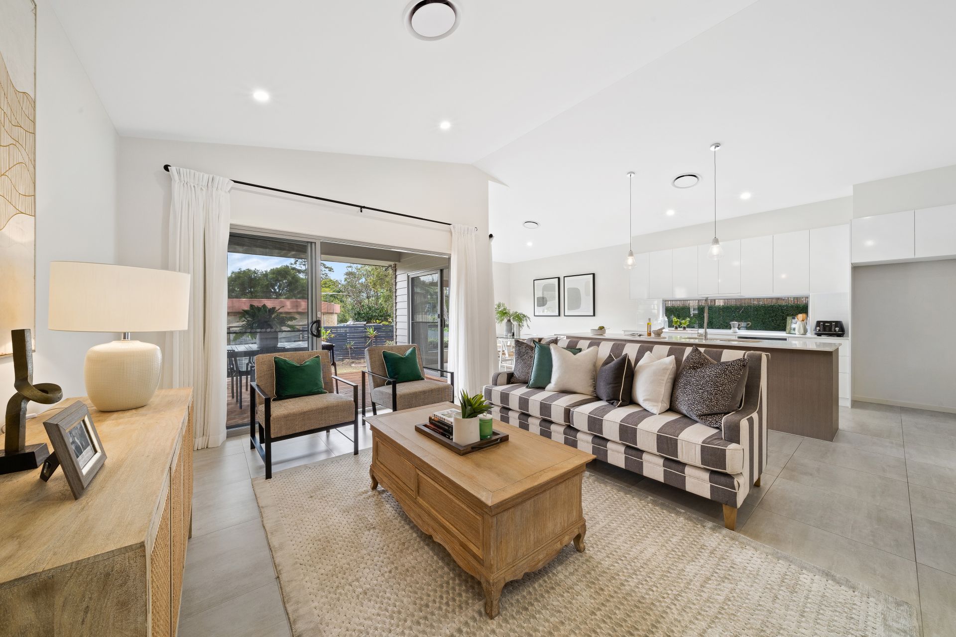 > The open plan main living/dining areas located at the heart of the home flow effortlessly to the kitchen and through to the outdoor entertaining area. The light and contemporary colour scheme plus the extra-high ceilings add to the expansive nature of the home, boasting Fujitsu ducted air-conditioning, down-lighting, tiled flooring, sliding windows and a bank of glass sliding doors giving you access to the rear deck and yard.