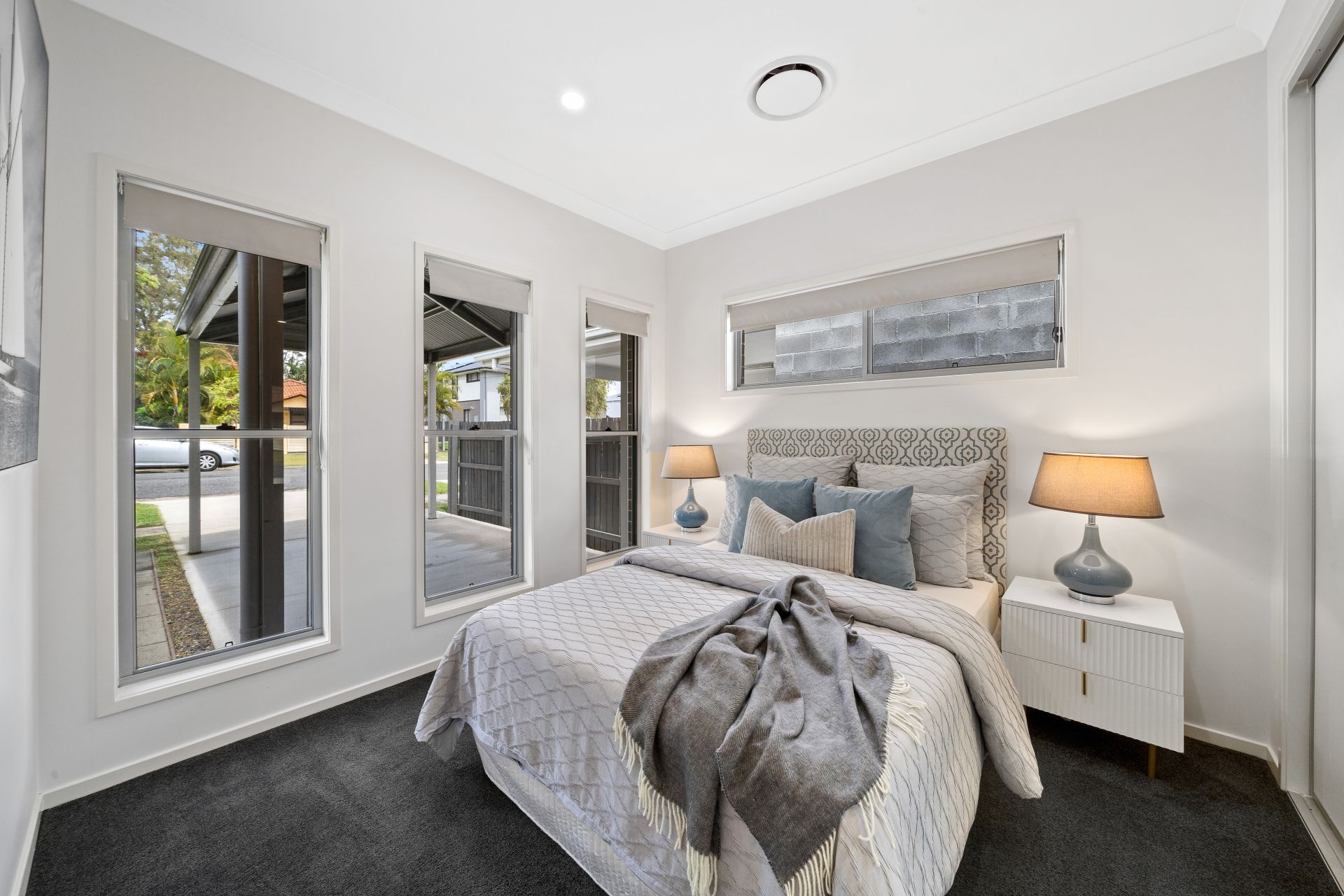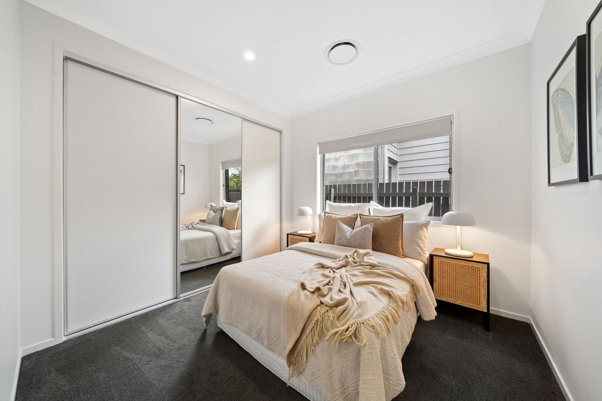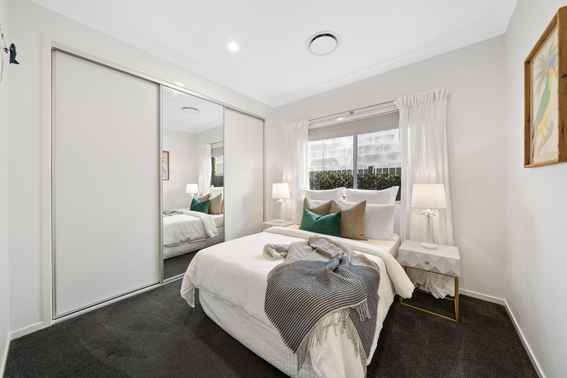 > Bedroom 3 offers extra-high ceilings, carpet flooring, built-in robes with mirror sliding doors, ducted air-conditioning, sliding windows with roller blinds.