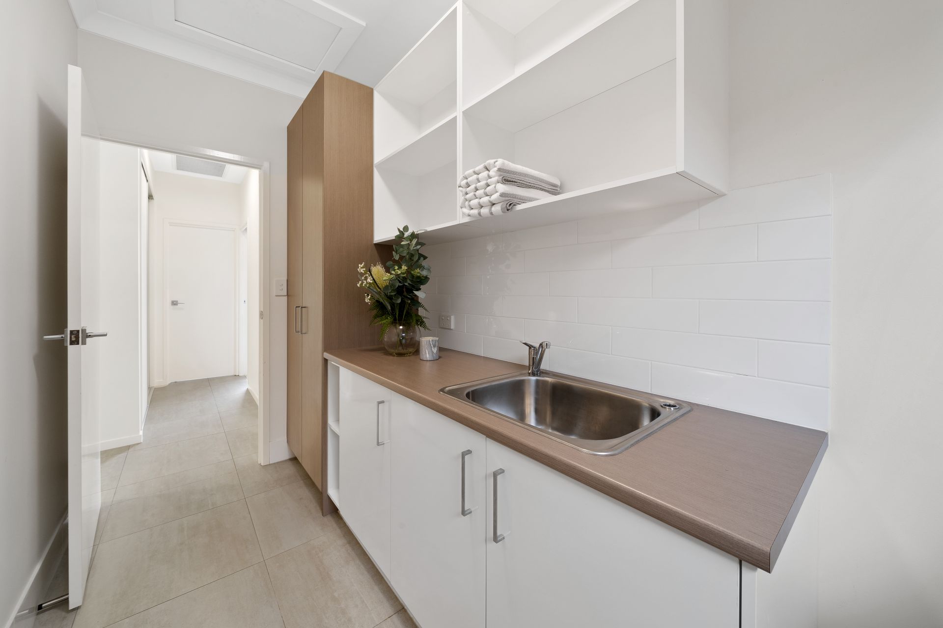 - Generous laundry featuring custom cabinetry with wash tub also boasting loads of bench and cupboard space.