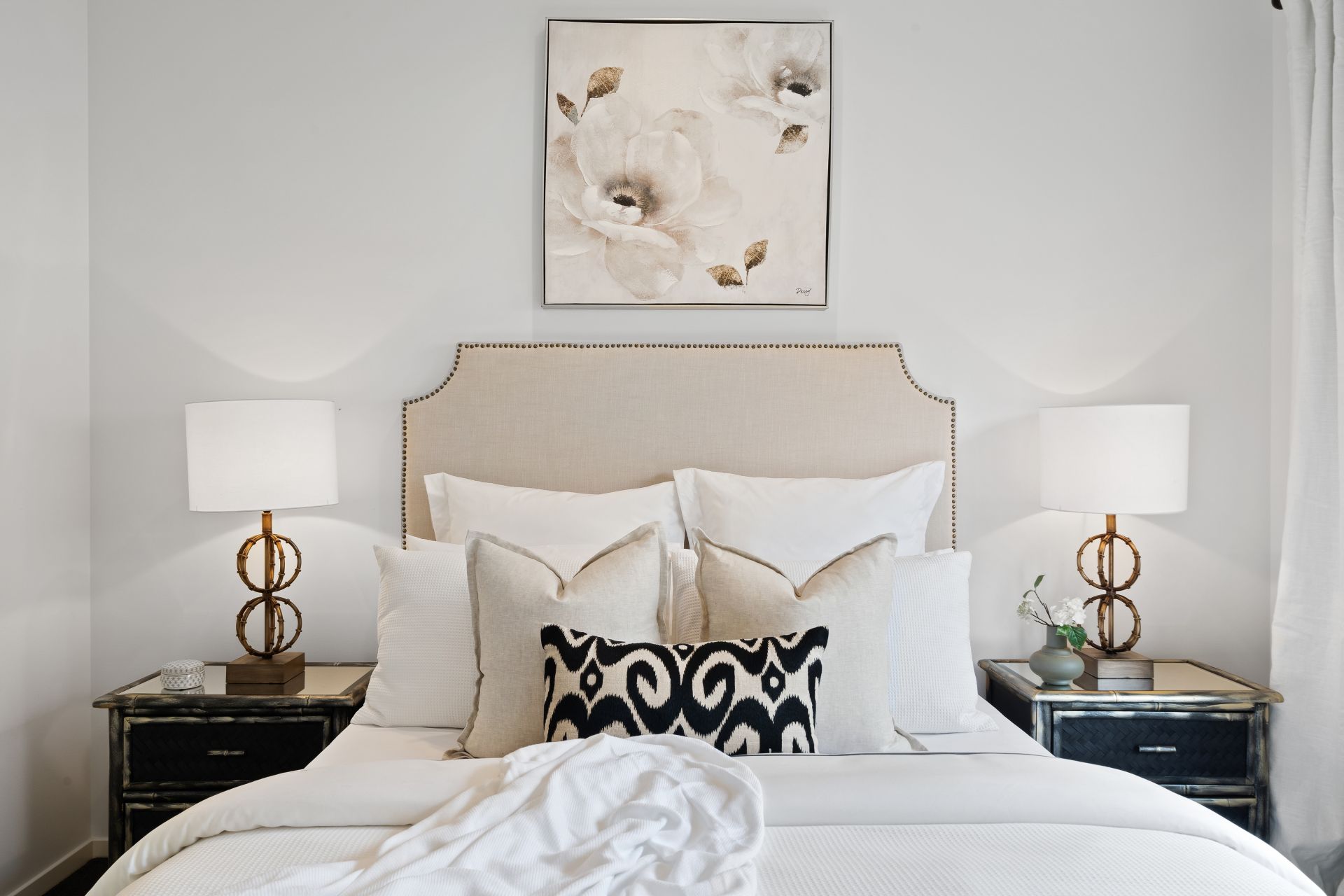 > The master bedroom located at the front of the home features an extra-high ceiling, ensuite, walk-in robe, down lighting, carpet flooring, ducted air-conditioning, sliding windows with roller blinds and curtains.