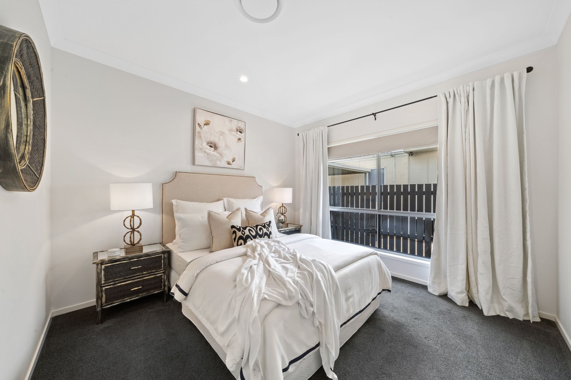 > Bedroom 4 offers extra-high ceilings, carpet flooring, built-in robes with mirror sliding doors, ducted air-conditioning, sliding windows with roller blinds and curtains.