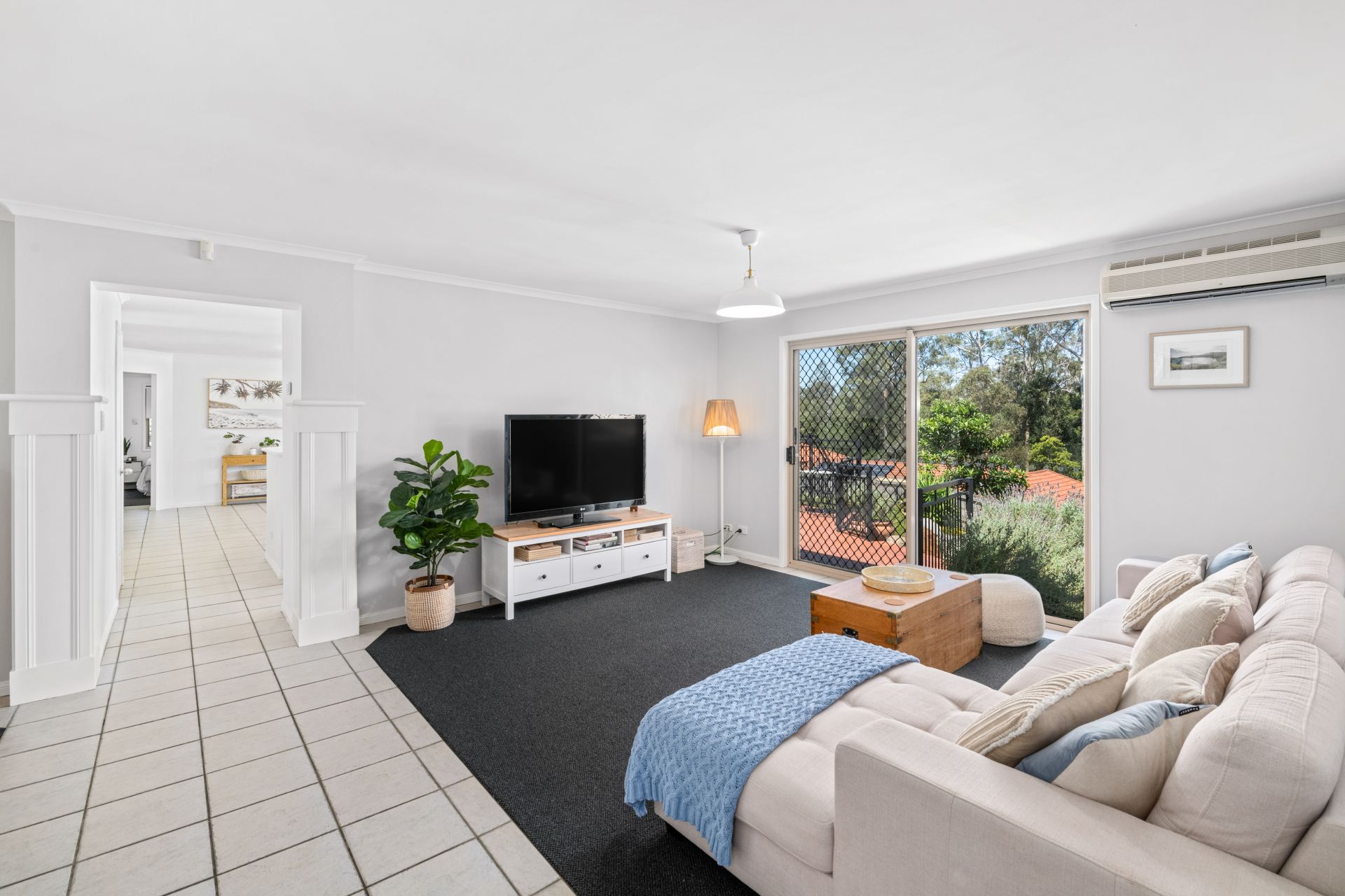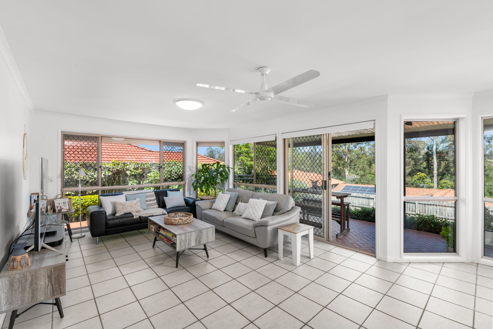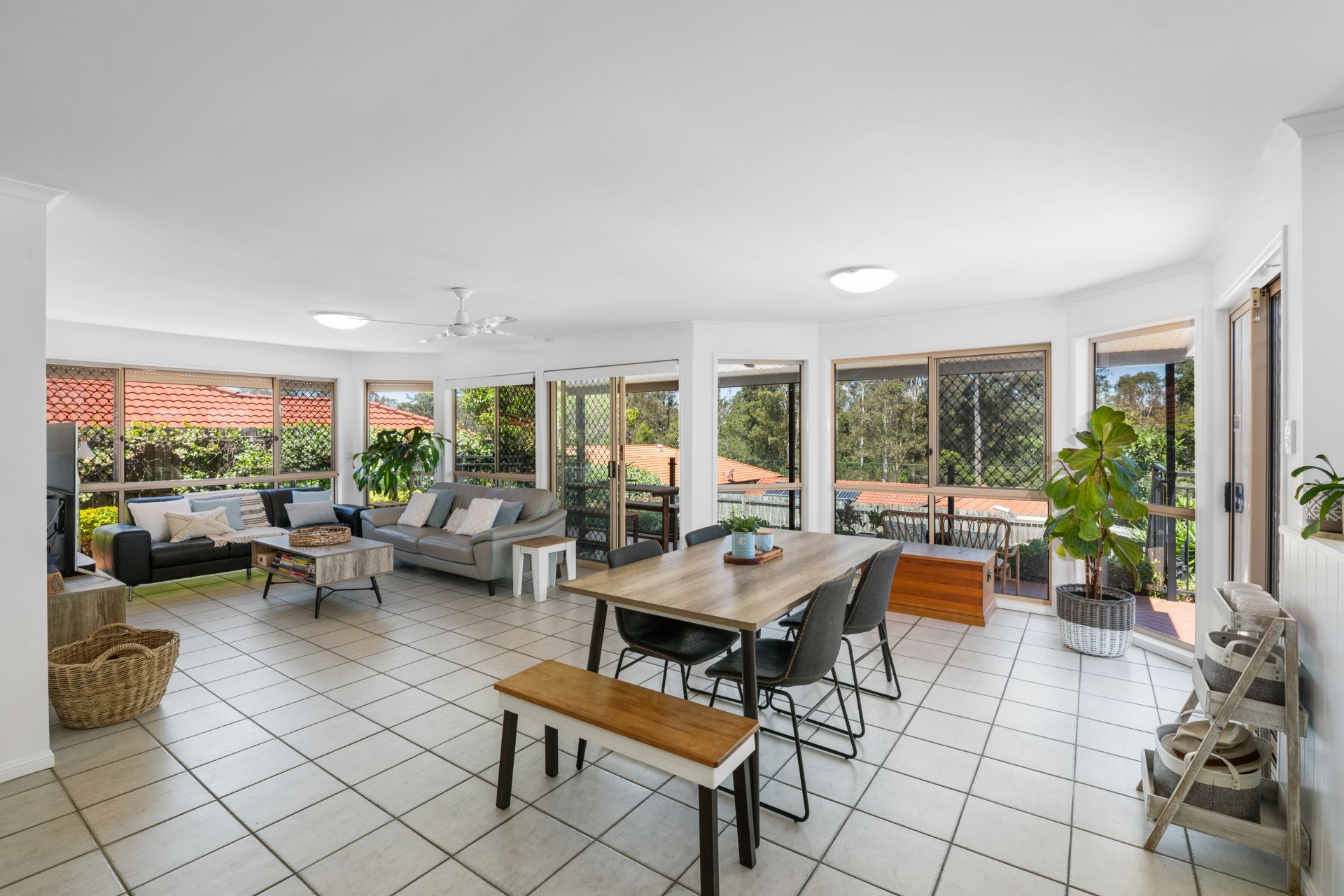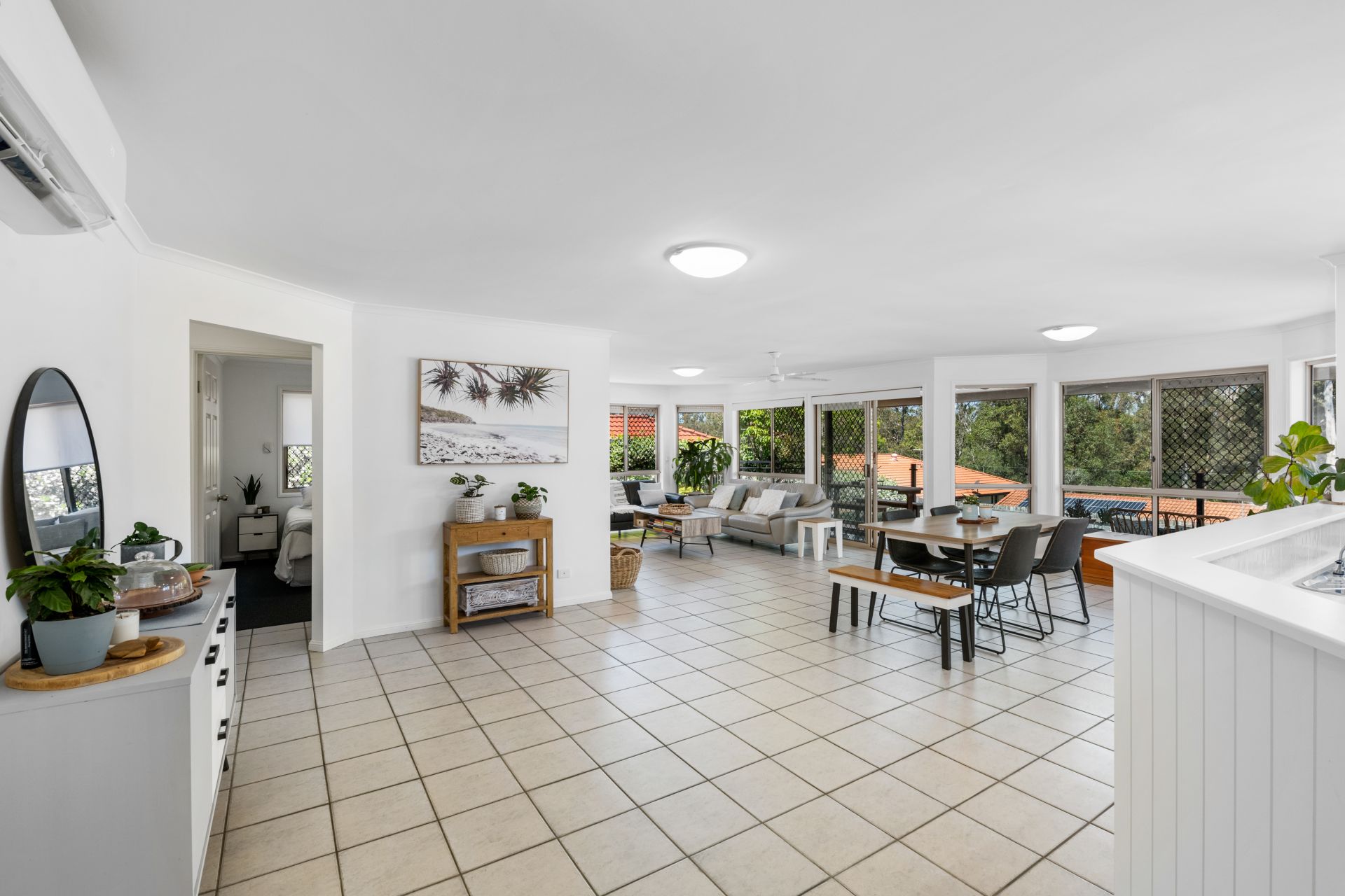 - Living and meals areas shares a large open plan with the home’s kitchen. Filled with an abundance of natural light through the many surrounding windows, this huge space features tiled flooring, split system air-conditioning and access to the outdoor entertaining and pool areas.