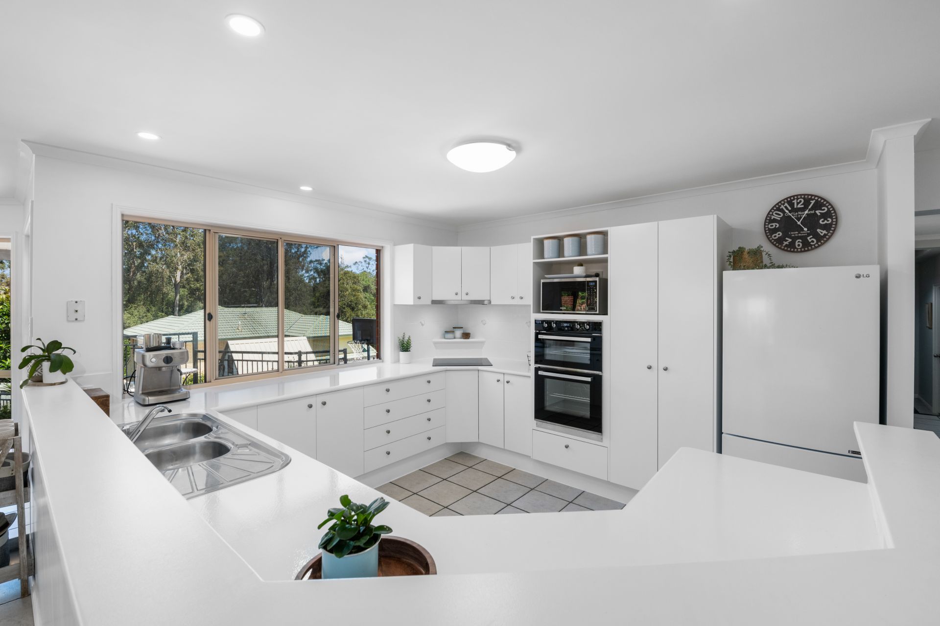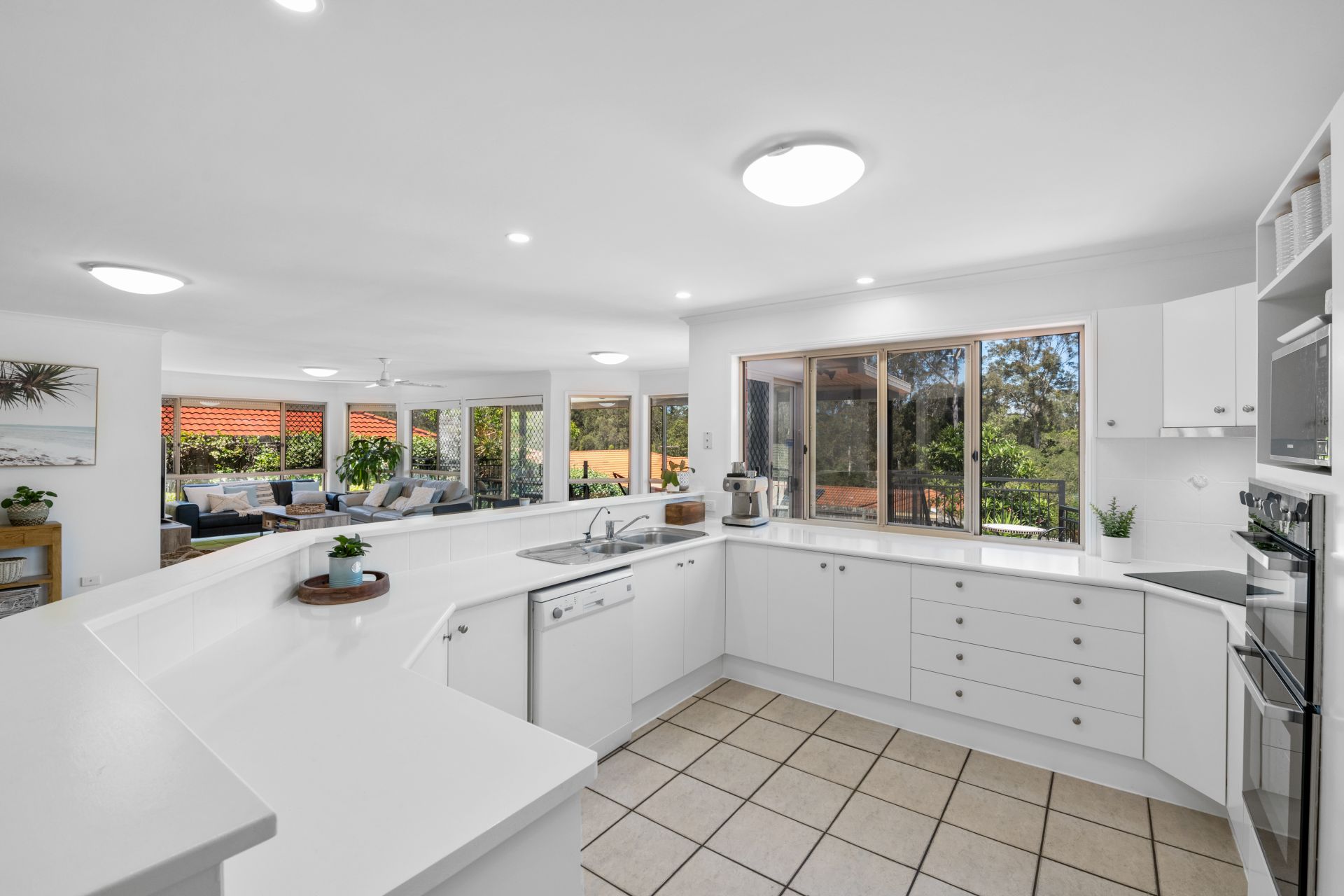 The beautiful kitchen shares a large, light-filled open space with the home’s living and meals area and looks out over the covered outdoor entertaining area and bushland reserve beyond. Its features include: