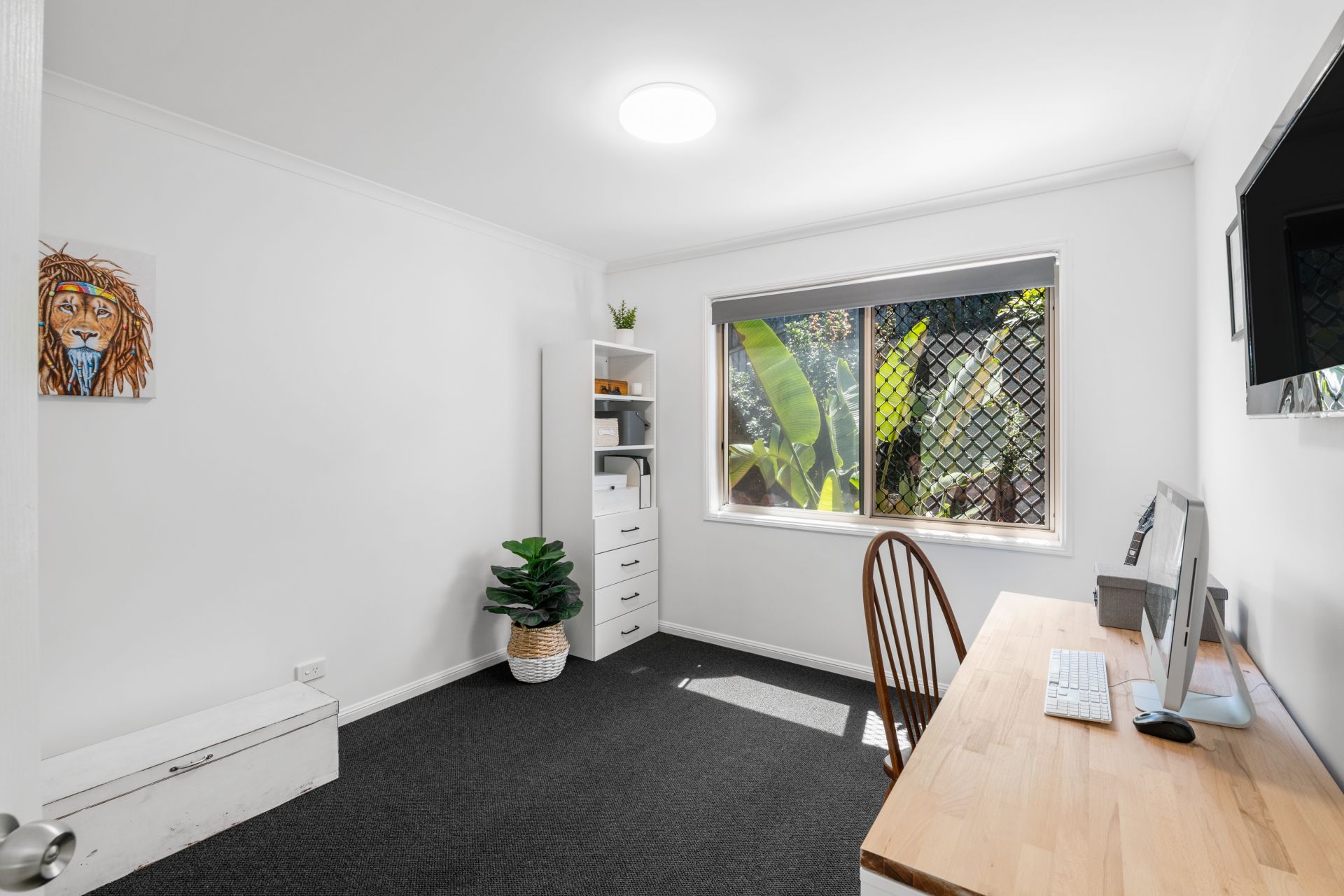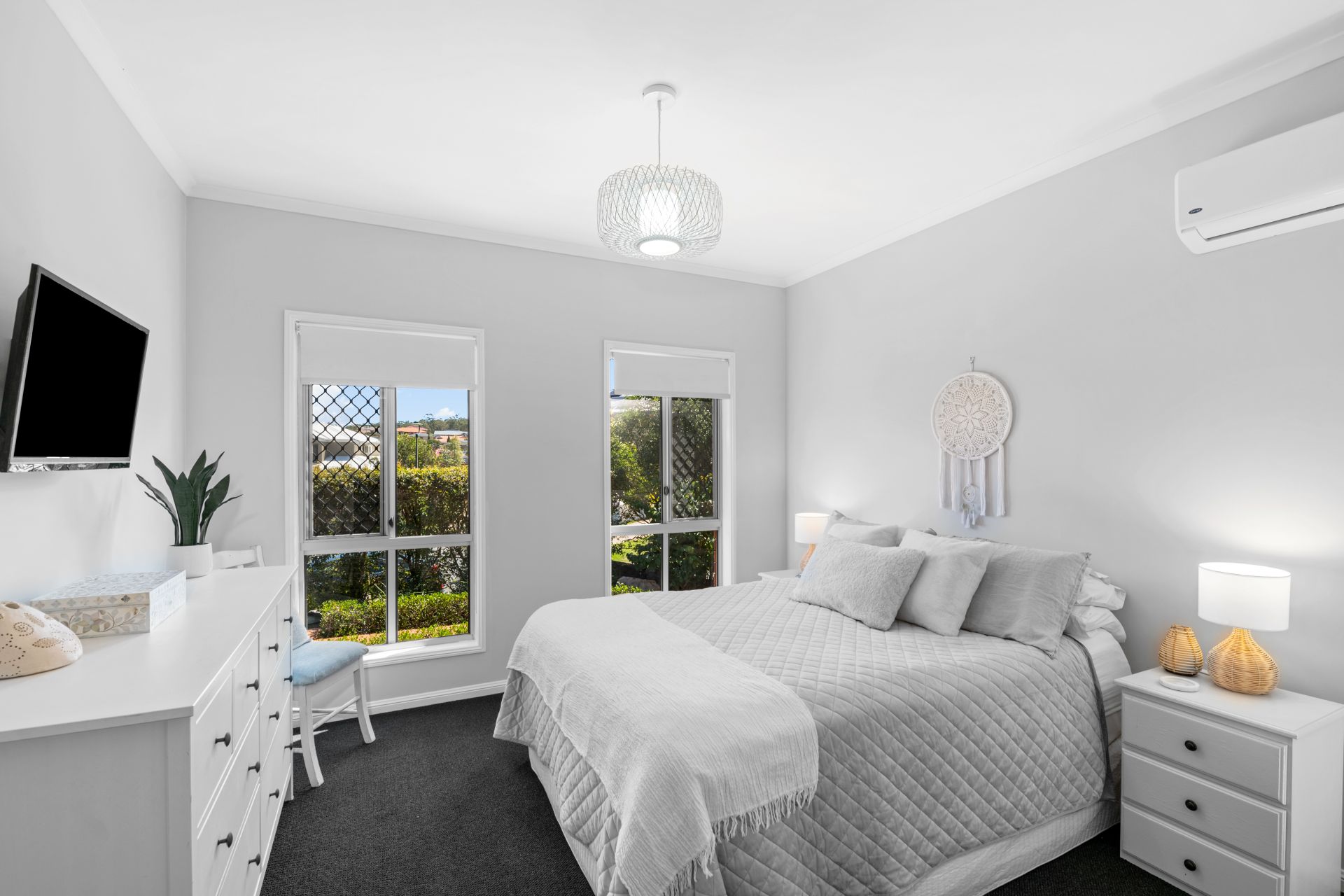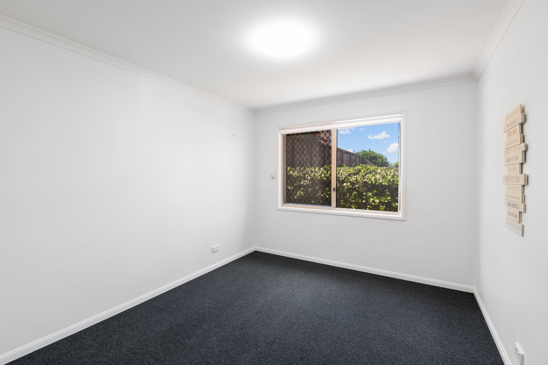 - Bedroom five is located at the front of the home, overlooking the peaceful tree-lined street and reserve beyond. This large room features carpeted flooring, 2.7m high ceiling, stacker plantation doors and roll-down blinds.