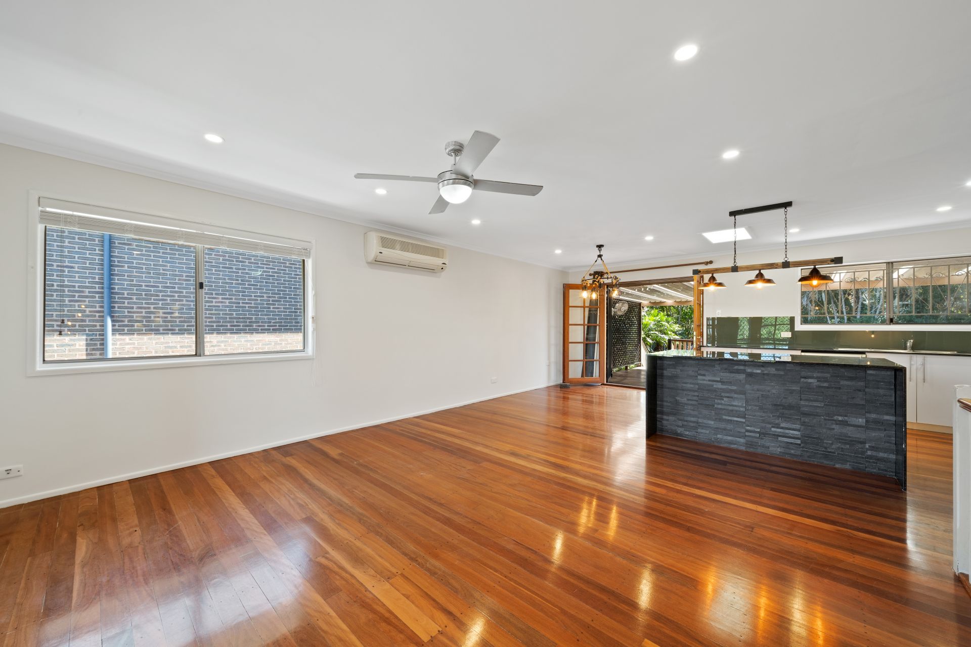 - Living room and meals area that share a large open plan with the home's kitchen. With access to both the front balcony and large rear entertainer's deck via French doors, this large room features polished timber flooring, split system air-conditioning and ceiling fan.