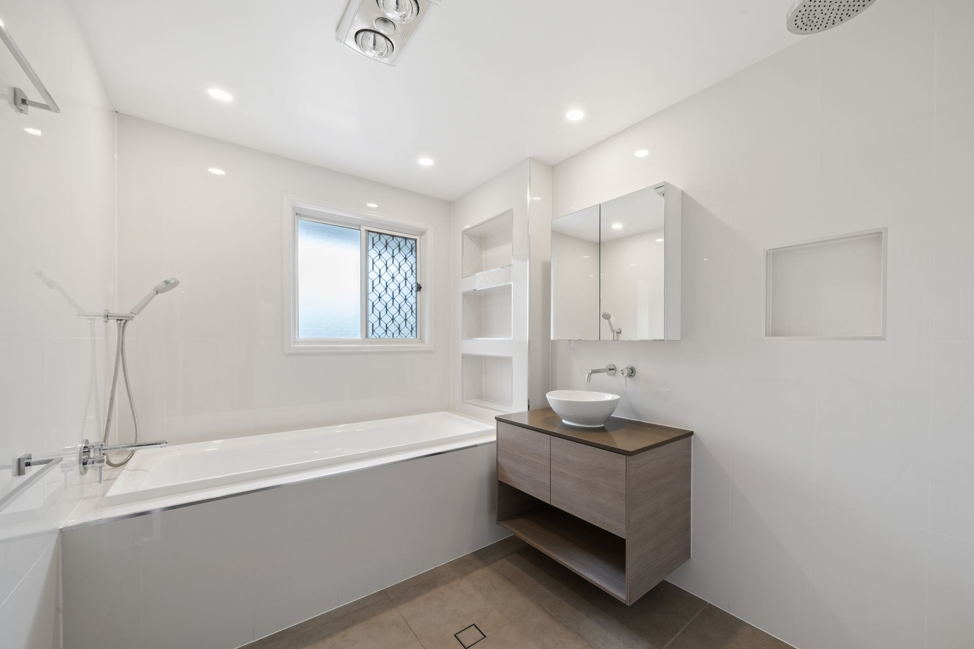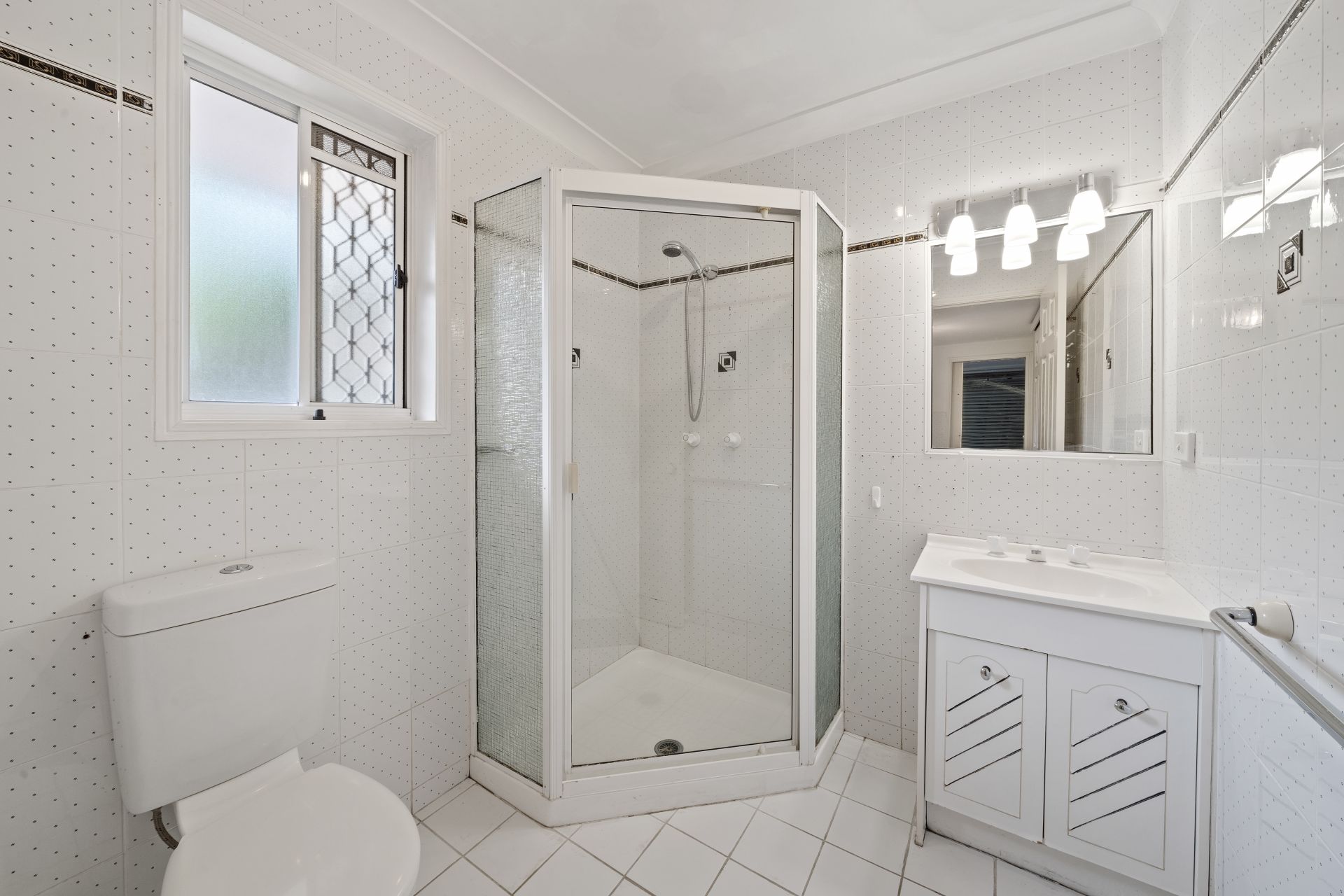 - Downstairs, located off the laundry, is a third existing bathroom enjoying a corner shower, toilet and single vanity with overhead mirror.