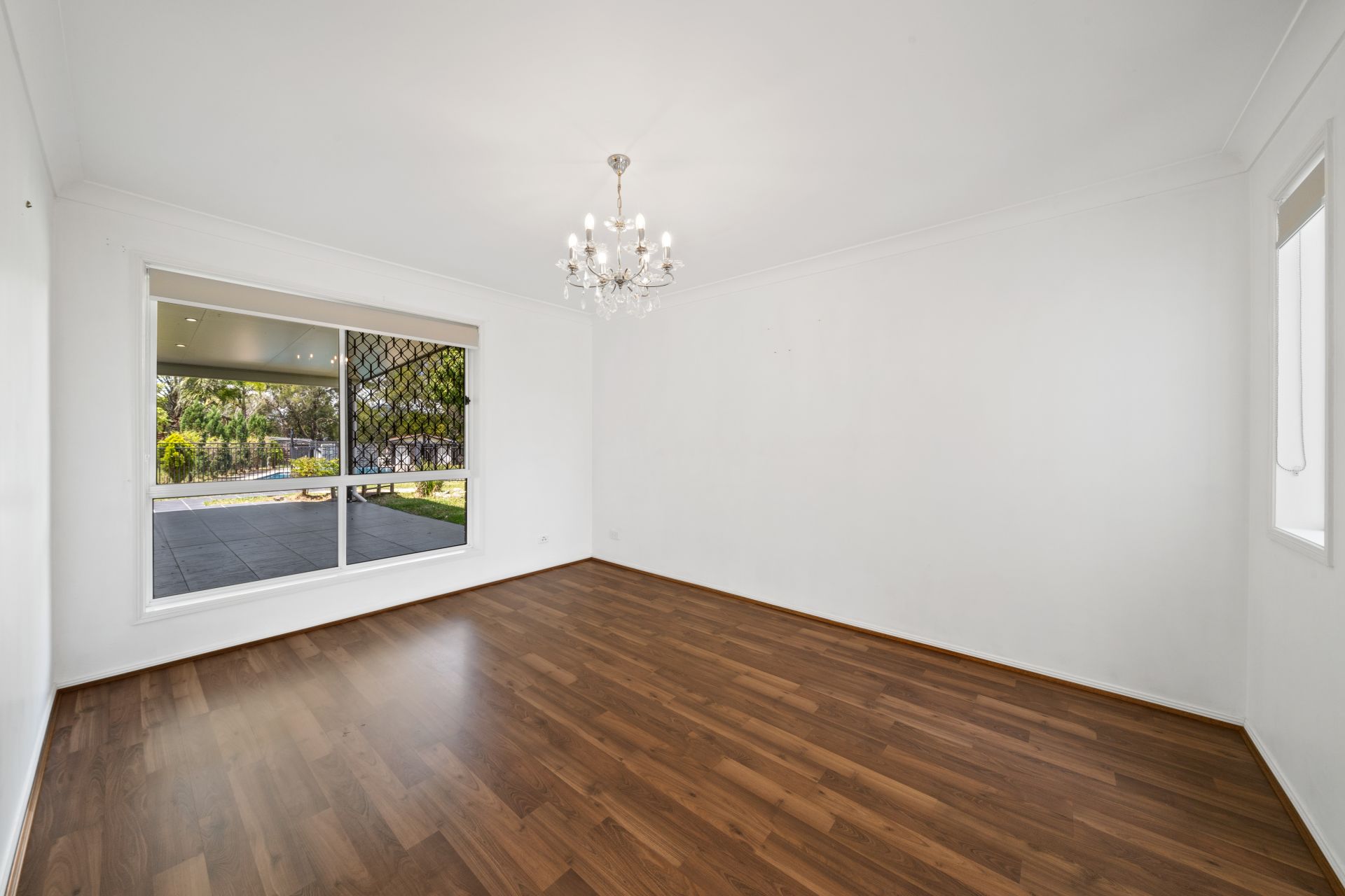 - Formal dining space with ornate chandelier light fitting, filled with natural light overlooking the back entertainment area and pool