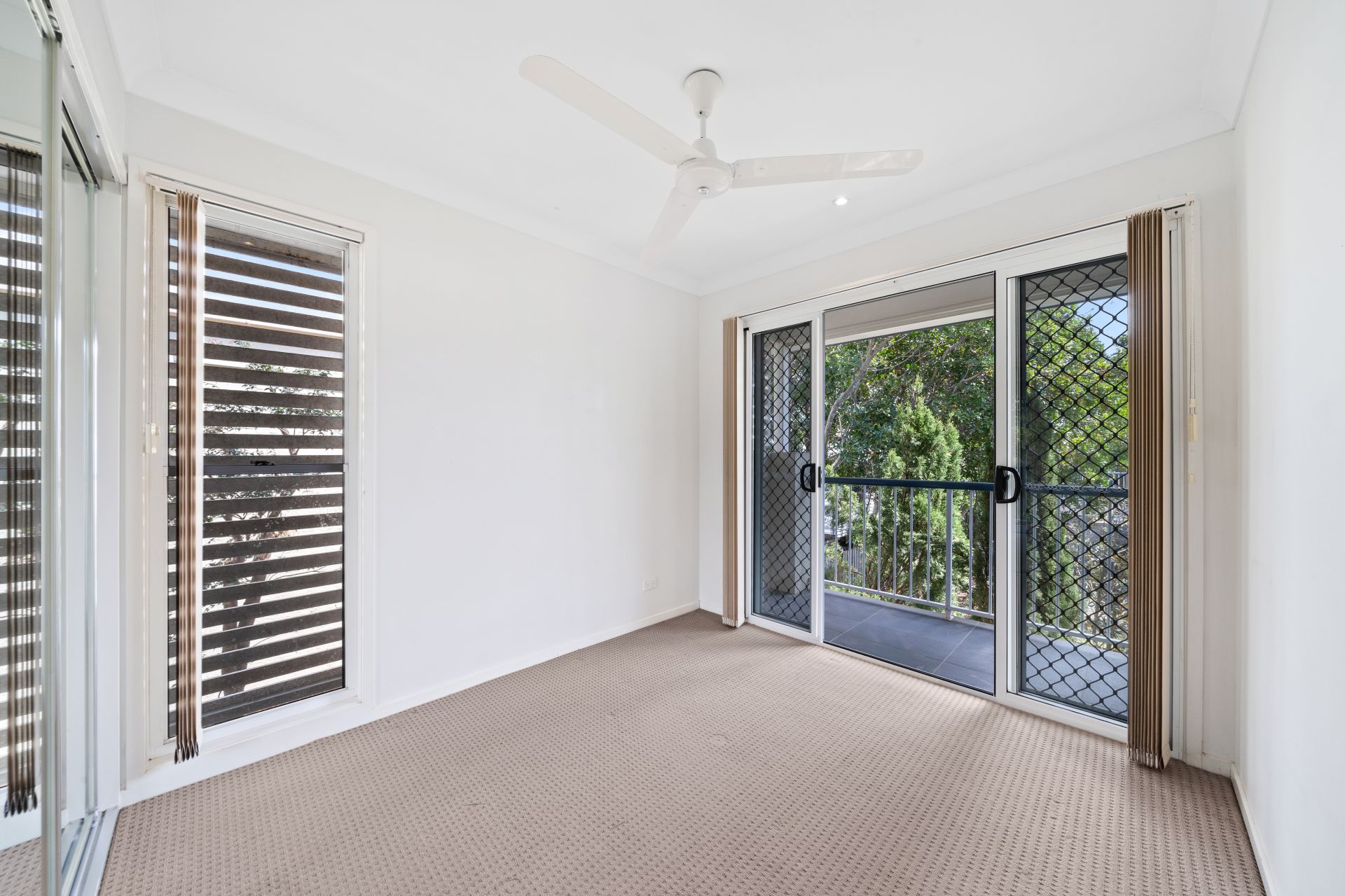 - Bedroom two is light-filled with fresh paint, new blinds, new carpet, access to a private balcony with security screens, a double mirrored wardrobe and a ceiling fan.