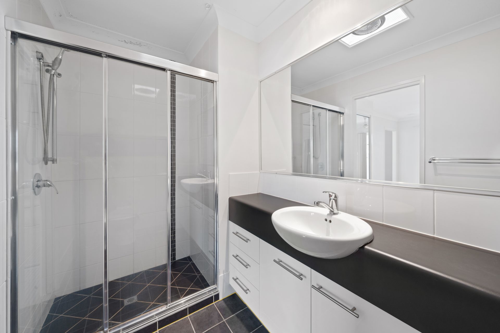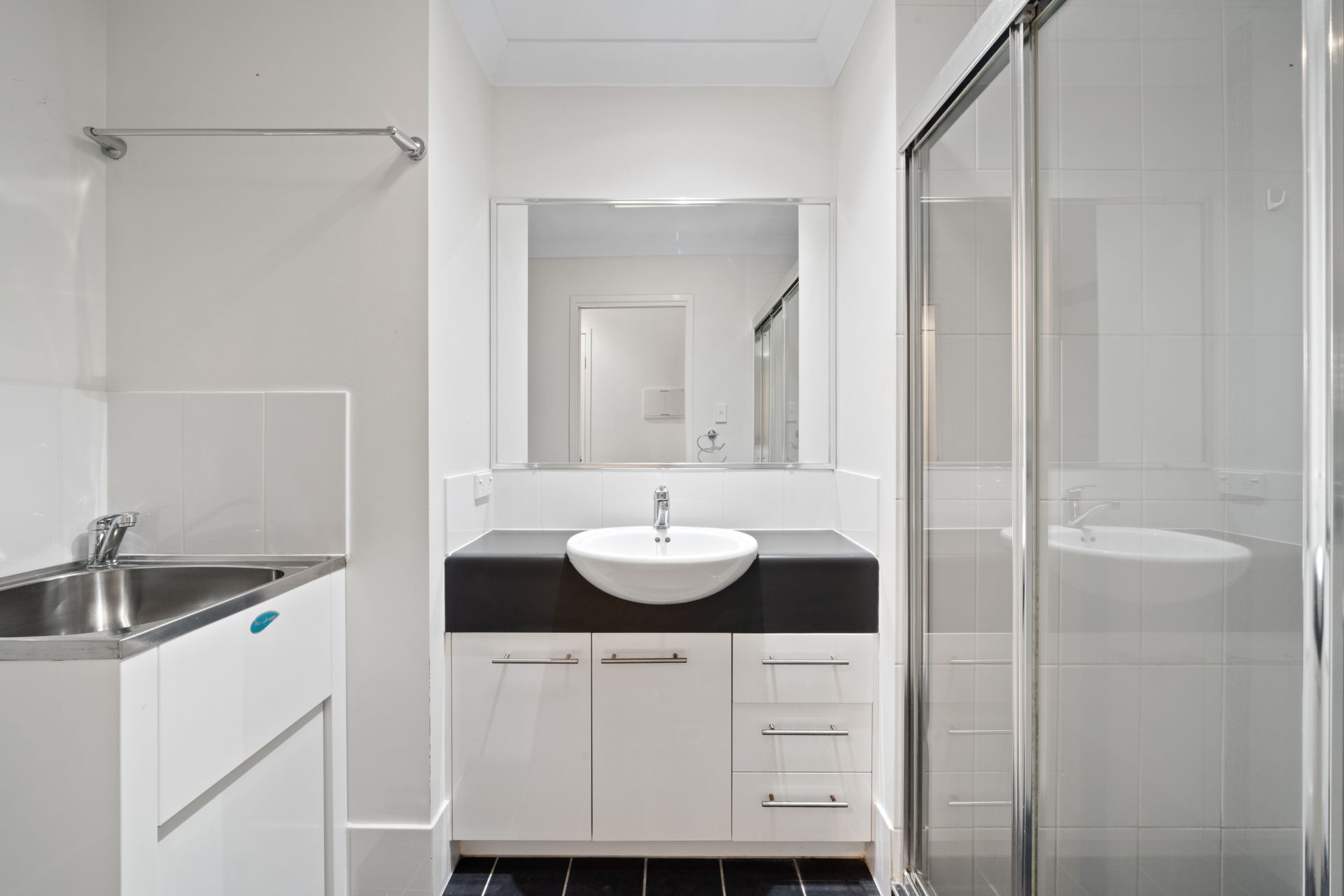 - Main bedroom is positioned near bedrooms two and three and includes the laundry. The large shower is light-filled thanks to a combined skylight and exhaust fan. The vanity features two doors and three drawers and a large framed mirror. The laundry area is perfect for a top or front loader washing machine and a large modern laundry tub.