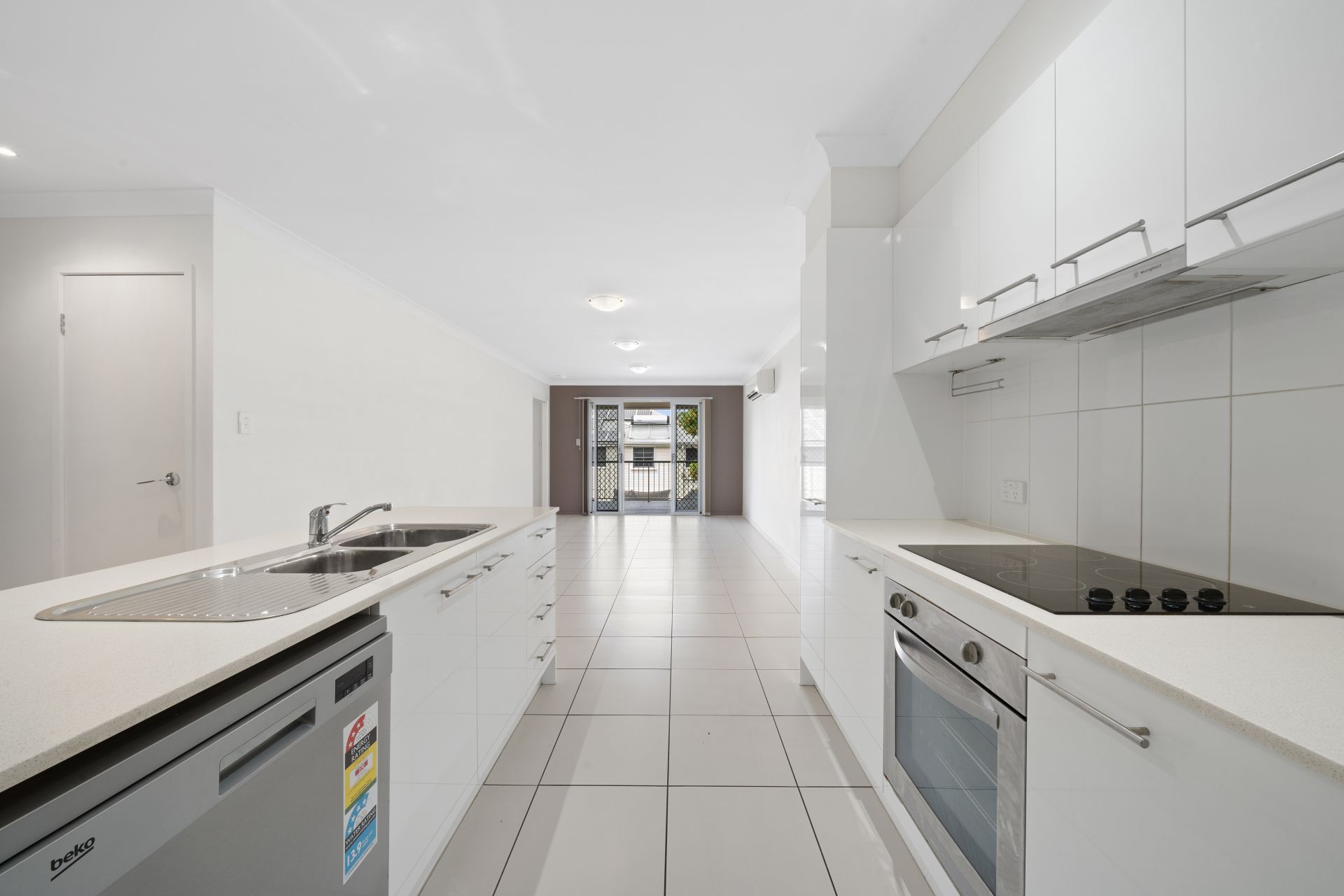 Modern kitchen features an island bench with breakfast bar, stone benchtops, loads of crisp white cabinetry, electric glass cooktop and under bench oven, tiled splash-bac, stainless steel Westinghouse rangehood, Beko dishwasher, stainless steel sink, large pantry and large fridge space.