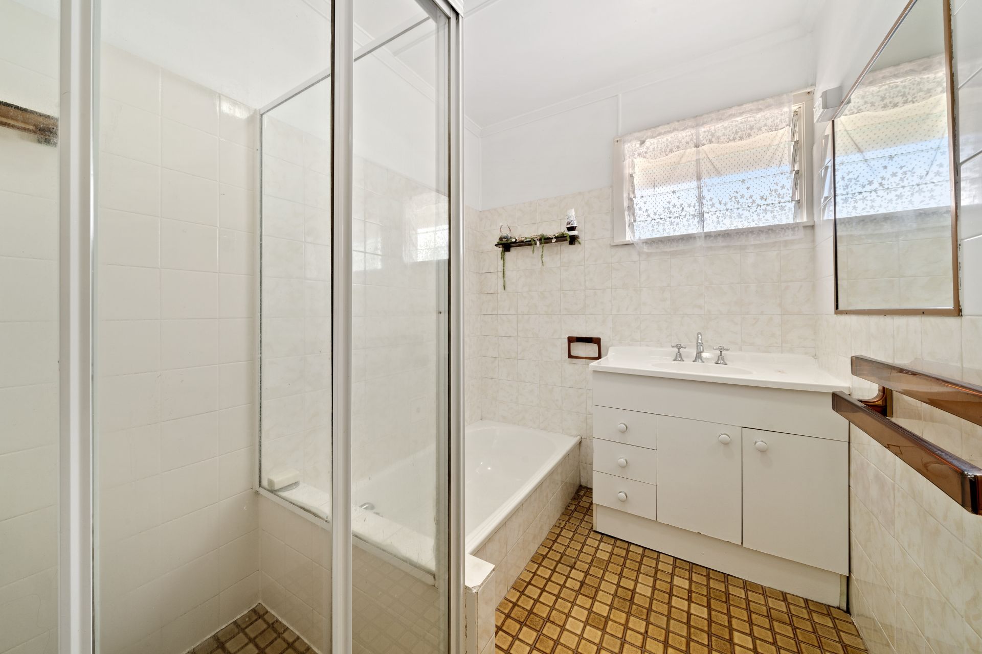> The well-appointed main bathroom located in the heart of the home features a shower and separate bath, vanity with plenty of storage, vanity mirror, towel rail, light/extractor, louvre window. The separate toilet is located near the laundry.