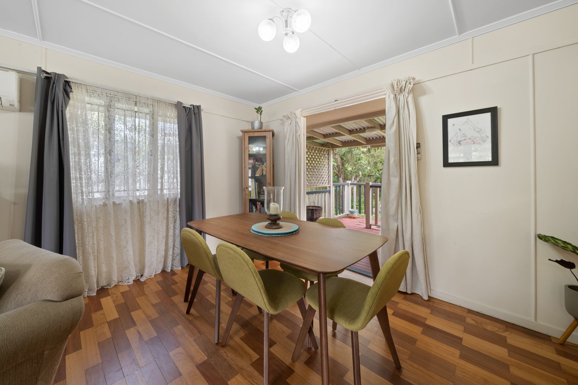 > The lounge living area flows effortlessly to the kitchen/ dining space and through French doors to the generous covered rear deck. Featuring rich timber flooring, casement windows, glass French doors, Fujitsu split system air-conditioning, ceiling fan, and pendant-lighting.