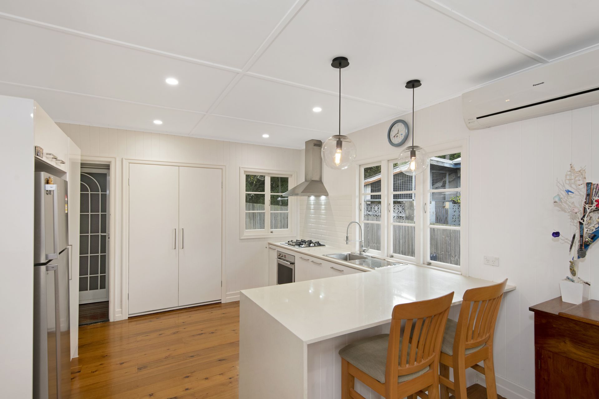 The modern chefs' kitchen features stone benches with breakfast bar, feature pendant light, VJ walls, polished timber floors, 4 burner gas cooktop, electric oven, dishwasher, large family size pantry & storage cupboard with direct access to the back deck