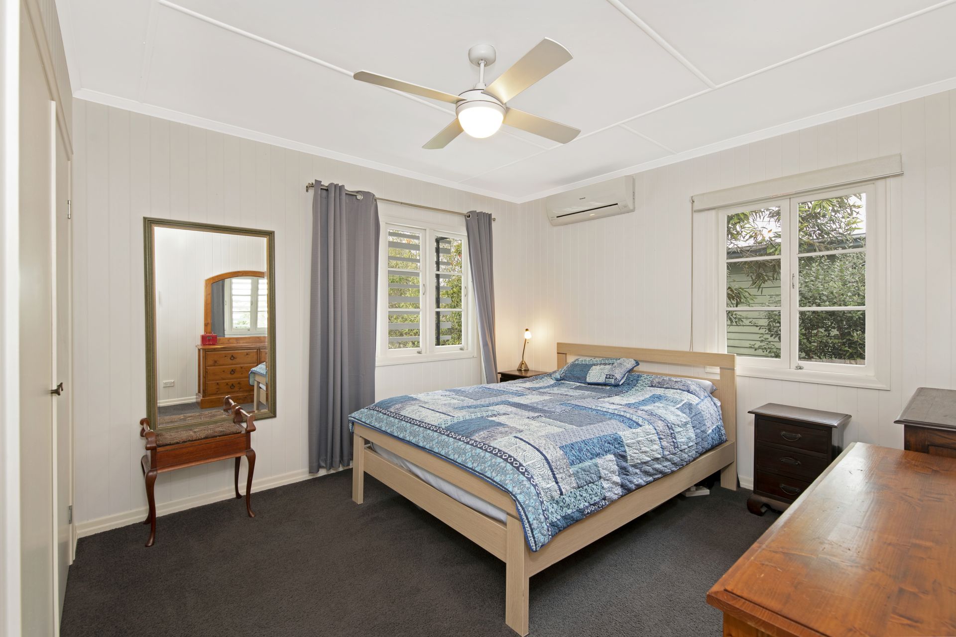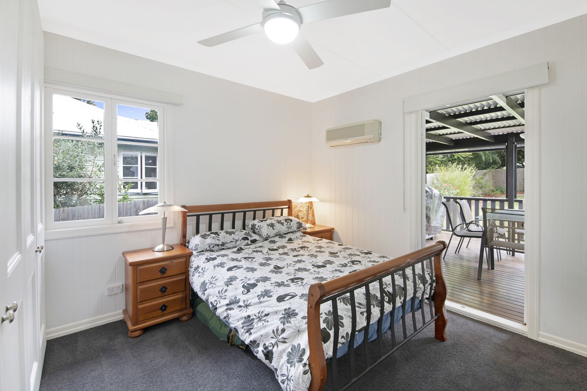 - Bedroom two is located at the back of the home and has direct access to the deck. The bedroom features carpet flooring, ceiling fan, split system air-conditioner, roller blinds and a built-in wardrobe