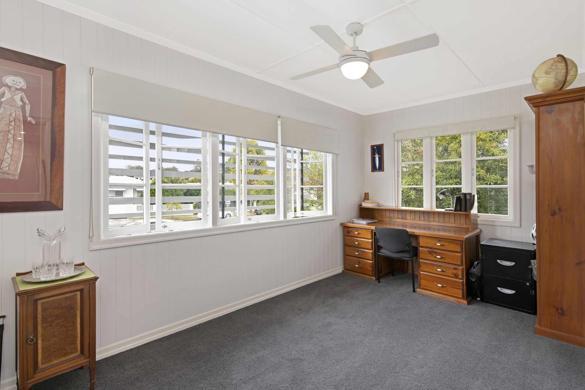 - Bedroom three is located at the front of the home with carpet flooring, VJ walls, ceiling fan and roller blinds