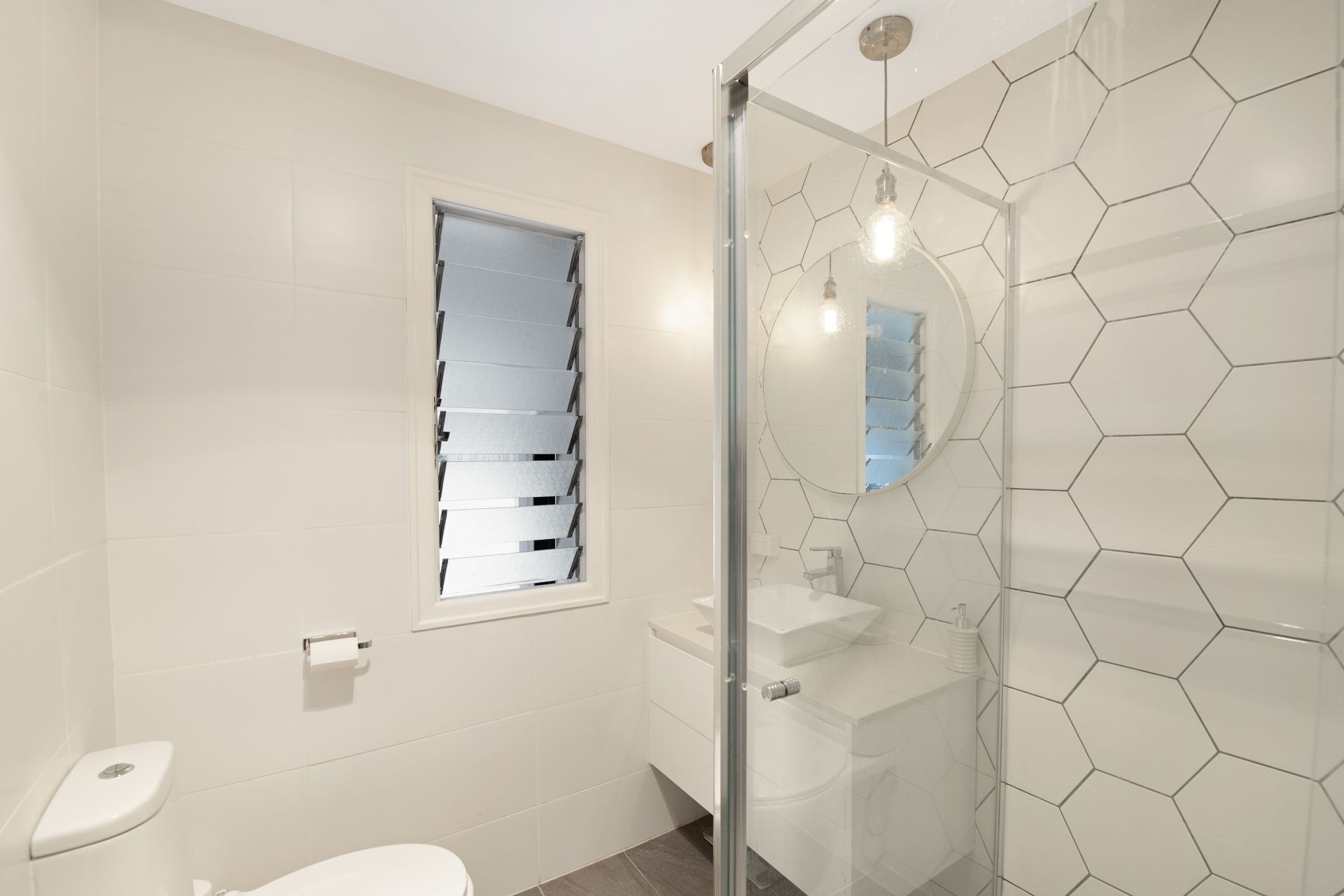 The bathroom features a neutral colour palette with floor to ceiling tiles, feature hexagon tiled wall, wall hung vanity with two drawers, stone benchtop, feature pendant light, round mirror and toilet
