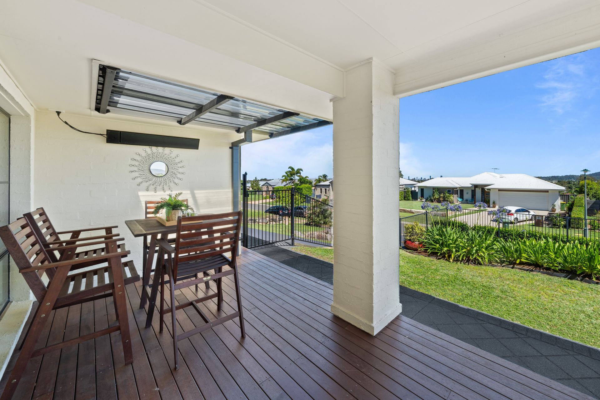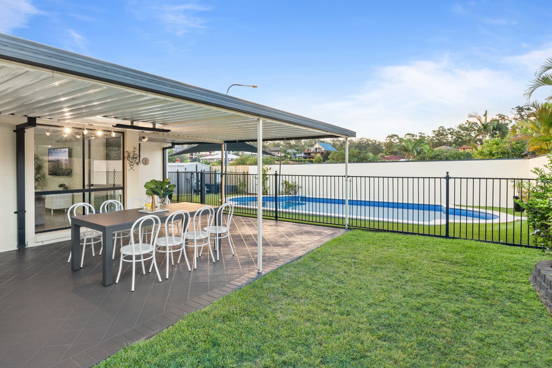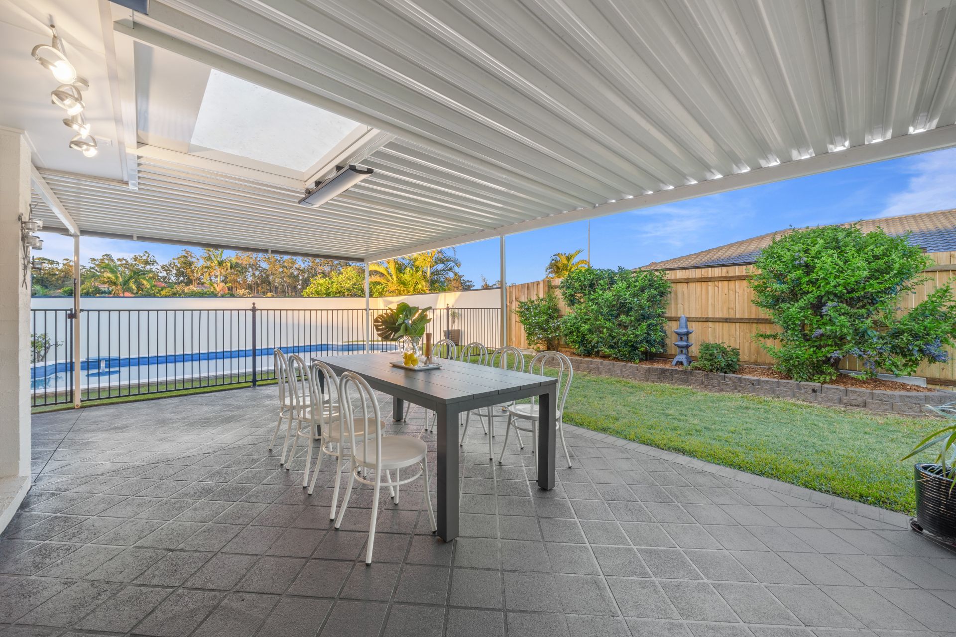 - Outdoor entertaining will be a breeze thanks to the many options this home provides from the covered patio boasting paved flooring, outdoor lighting, built in benchtop, heat strip and outdoor power points, complimented by the glistening in-ground pool, surrounding garden beds and fully fenced kid/pet friendly yard, to the front deck offering a breath-taking city views, heat strip, outdoor power points, lush sculpted gardens and the fully enclosed split level kid/pet friendly front yard encapsulating everything there is to love about our Queensland lifestyle.