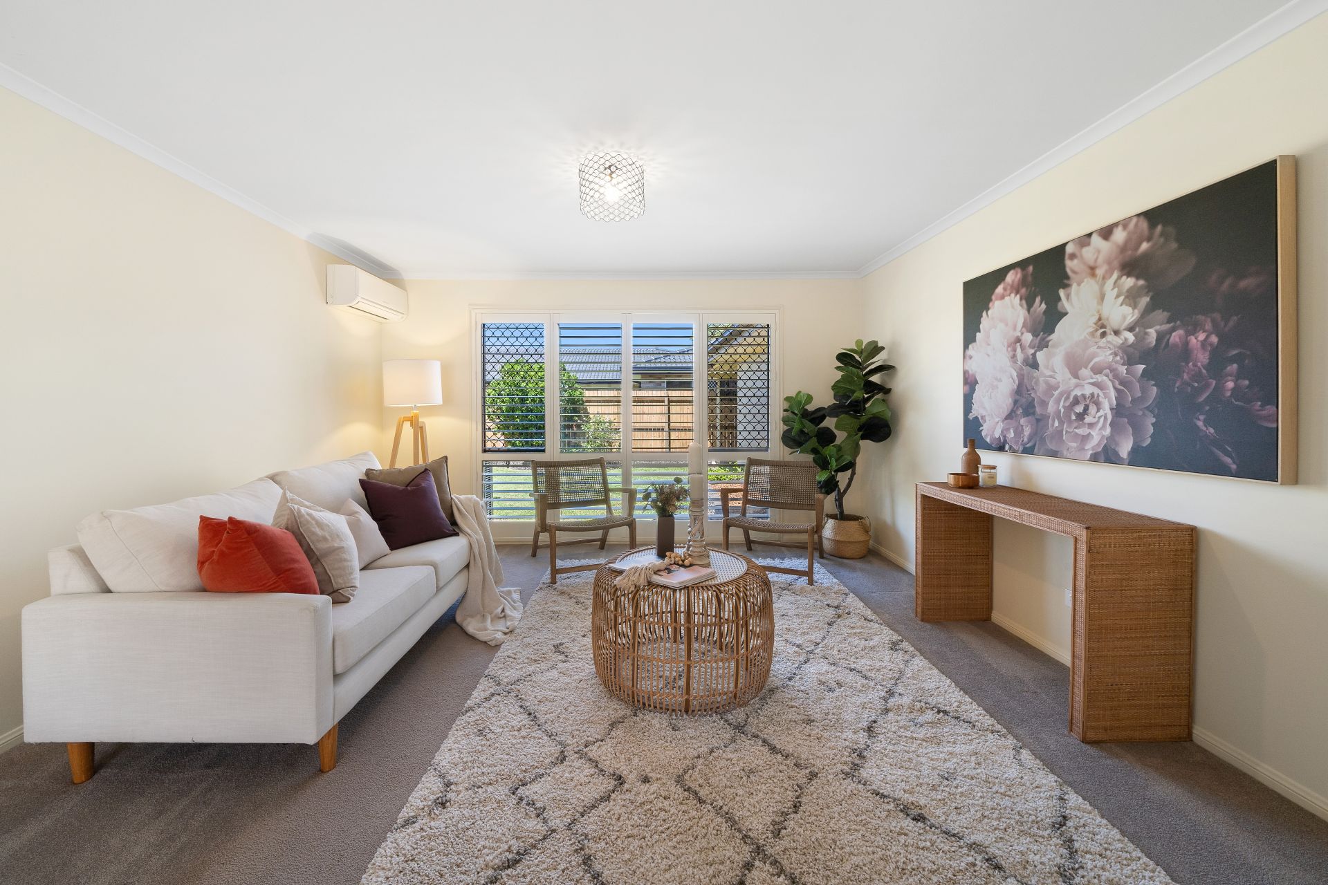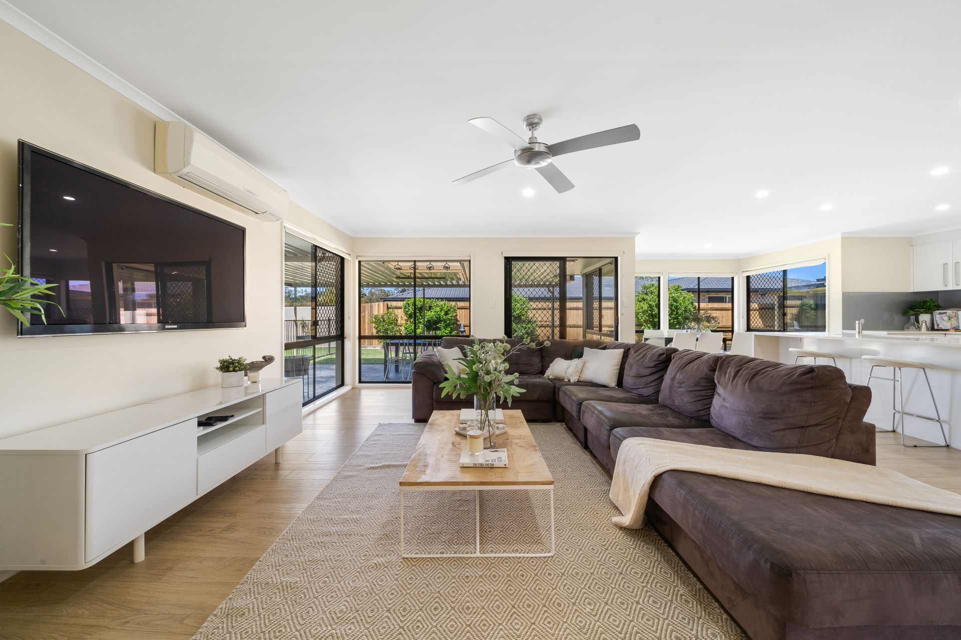> Located on the other side of the kitchen is the second living room featuring Mitsubishi air-conditioning, down-lights, plush carpet flooring, sliding glass windows with shutters and security screens.