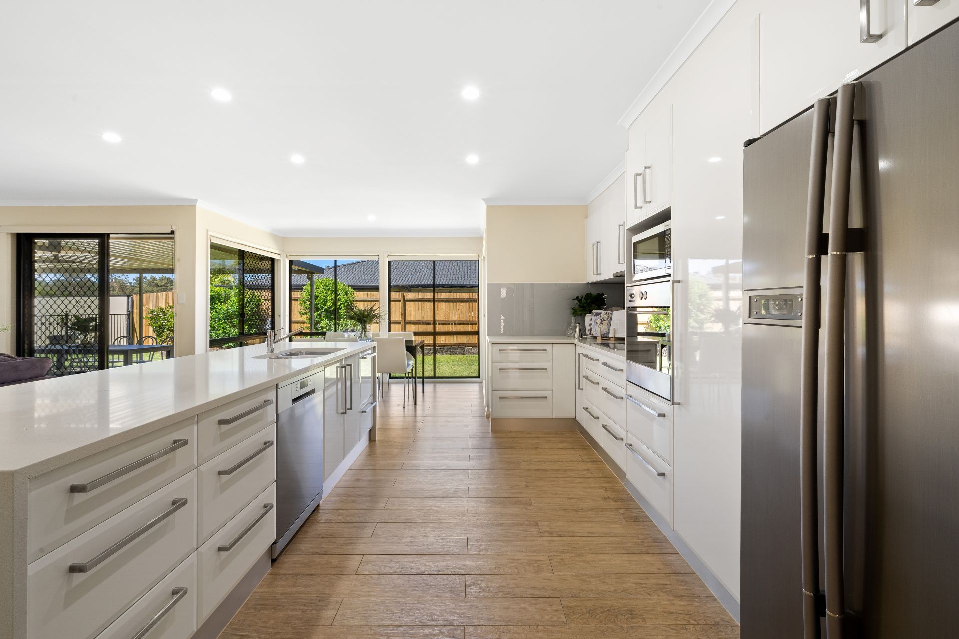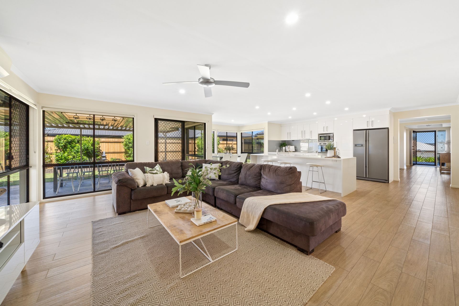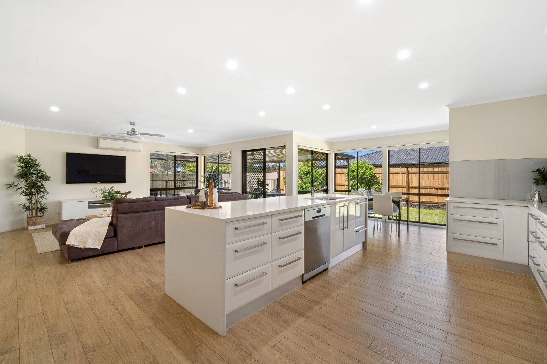 > The open plan lounge/dining areas located at the heart of the home flow effortlessly to the kitchen, through to the living and out to the outdoor entertaining area. The light and contemporary colour scheme adds to the expansive nature of the home, boasting Mitsubishi split system air-conditioning, down-lighting, ceiling fan, rich timber tiles, sliding and fixed windows with security screens as well as roller blinds.