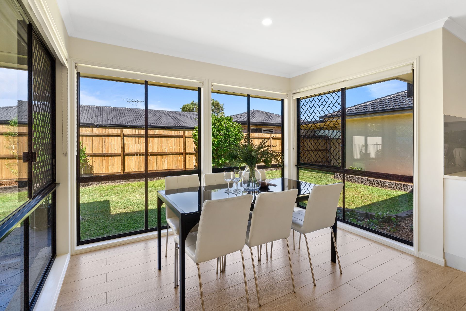> Located off the second living room is the large dining room featuring wood-look tiles, down-lights, sliding windows with shutters and security screens.