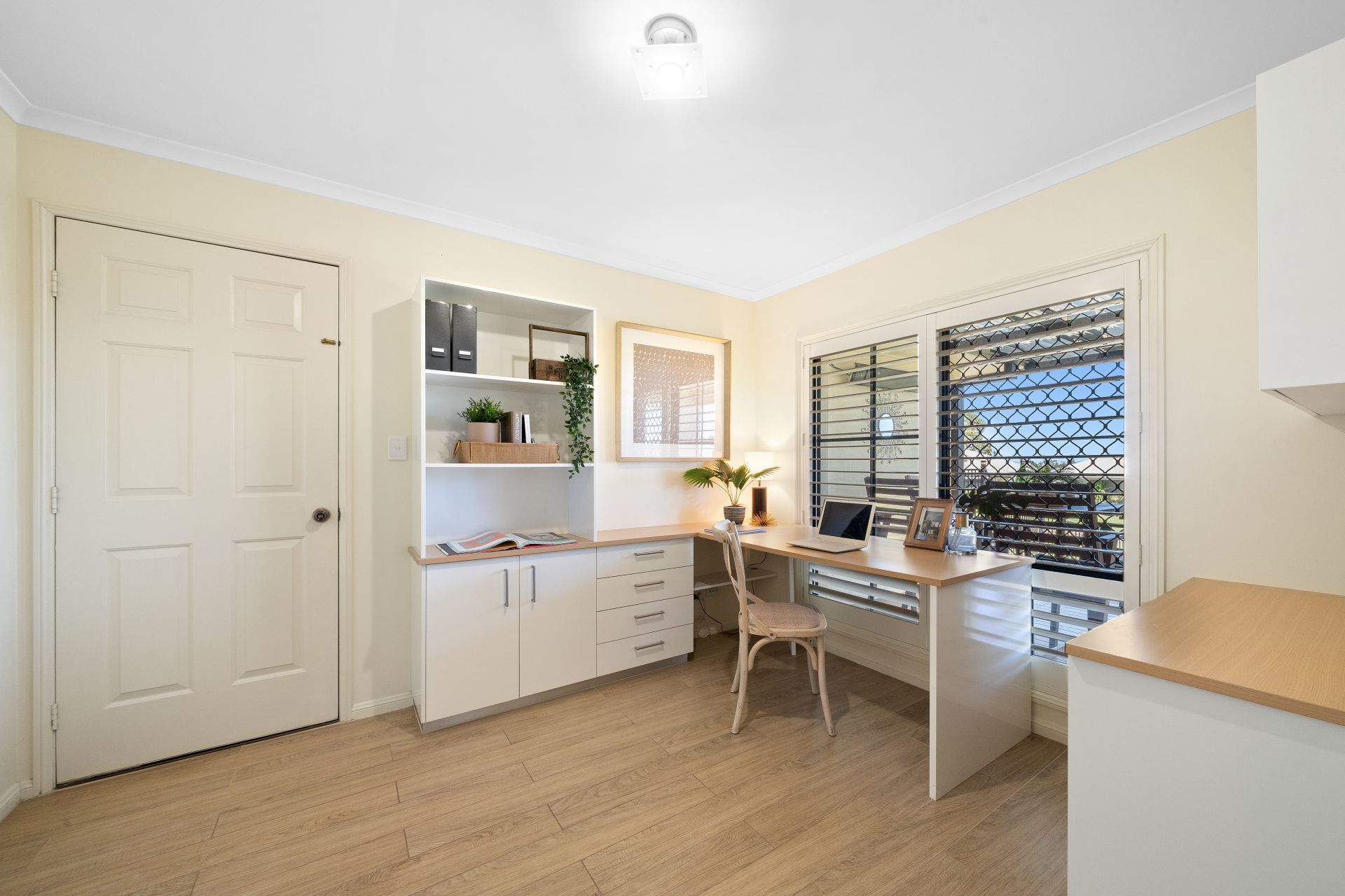 > Perfect for the working from home lifestyle is the office space boasting city views, in-built desks and cabinetry, standard lighting, and wood-look tiled flooring.