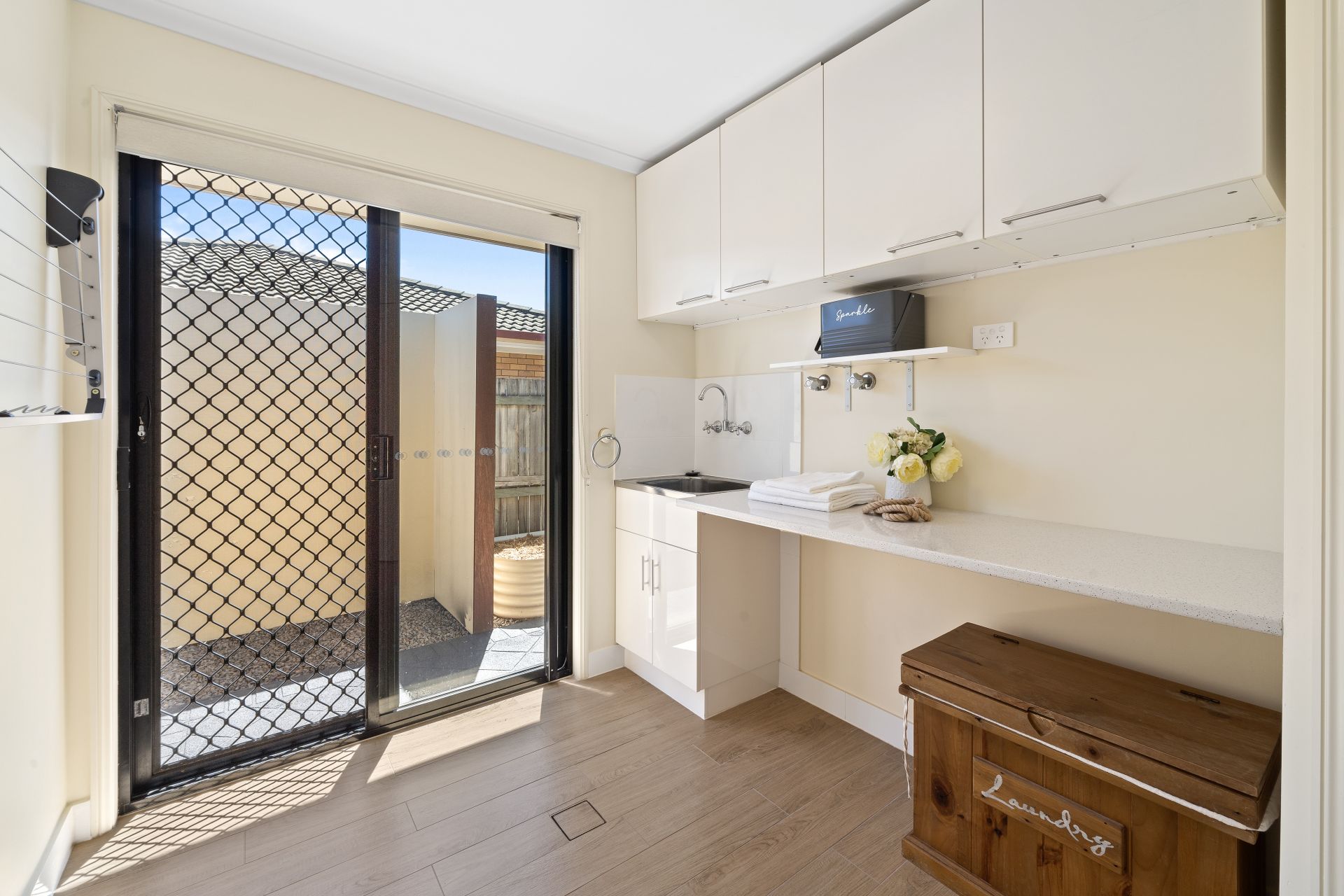 - The laundry features large walk in storage cupboard, laminate bench tops with cabinetry as well as indoor and outdoor clothes lines.