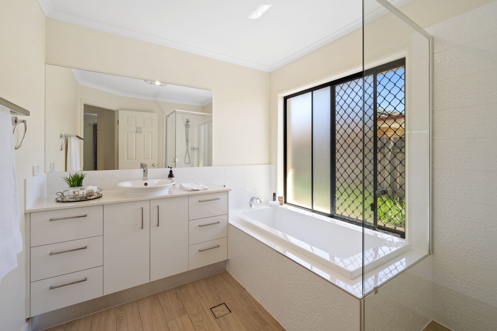 > The main bathroom features a shower with separate bath, huge single basin stone topped vanity with plenty of storage, large framed vanity mirror, extractor/heat/light combo, towel rack, sliding frosted window with security screens and separate toilet.