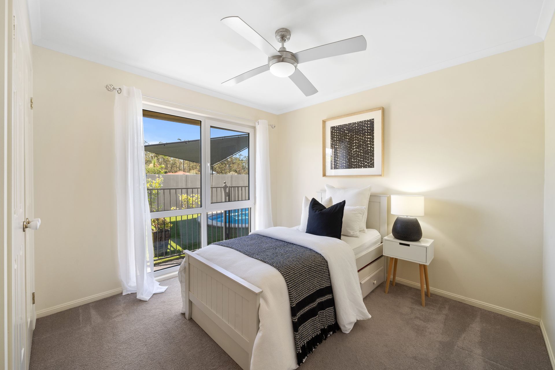 > Located at the end of the house, bedrooms 3 & 4 enjoy built-in-robes, plush carpet flooring, ceiling fans with built-in light, modern style casement windows with fly screens and curtains and external retractable privacy shutters.