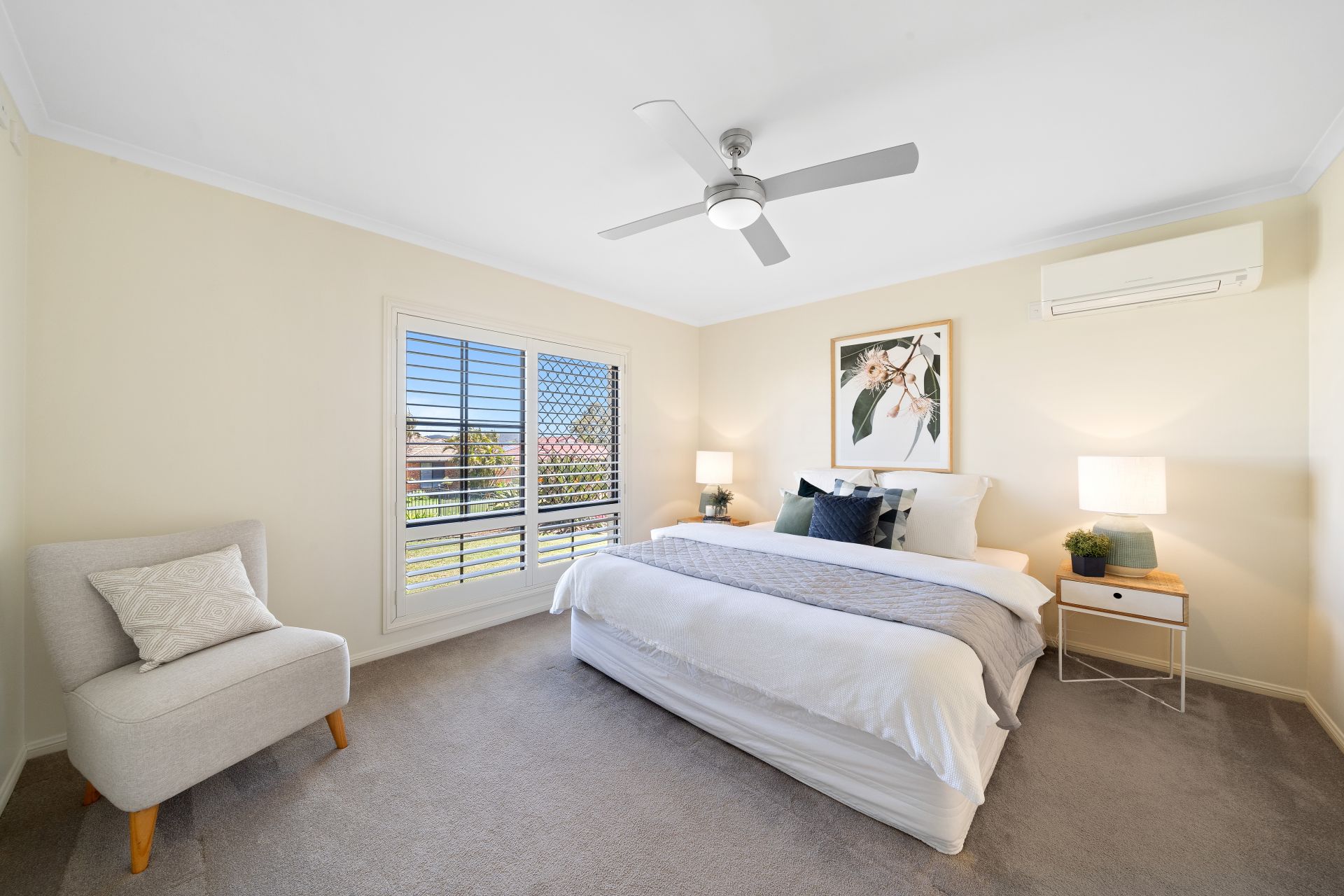 > Located at the entrance to the home is the king size master boasting city views, chic ensuite, Mitsubishi air-conditioning, plush carpet flooring, spacious walk-in robe, ceiling fan with built-in light, sliding windows with security screens and plantation shutters.