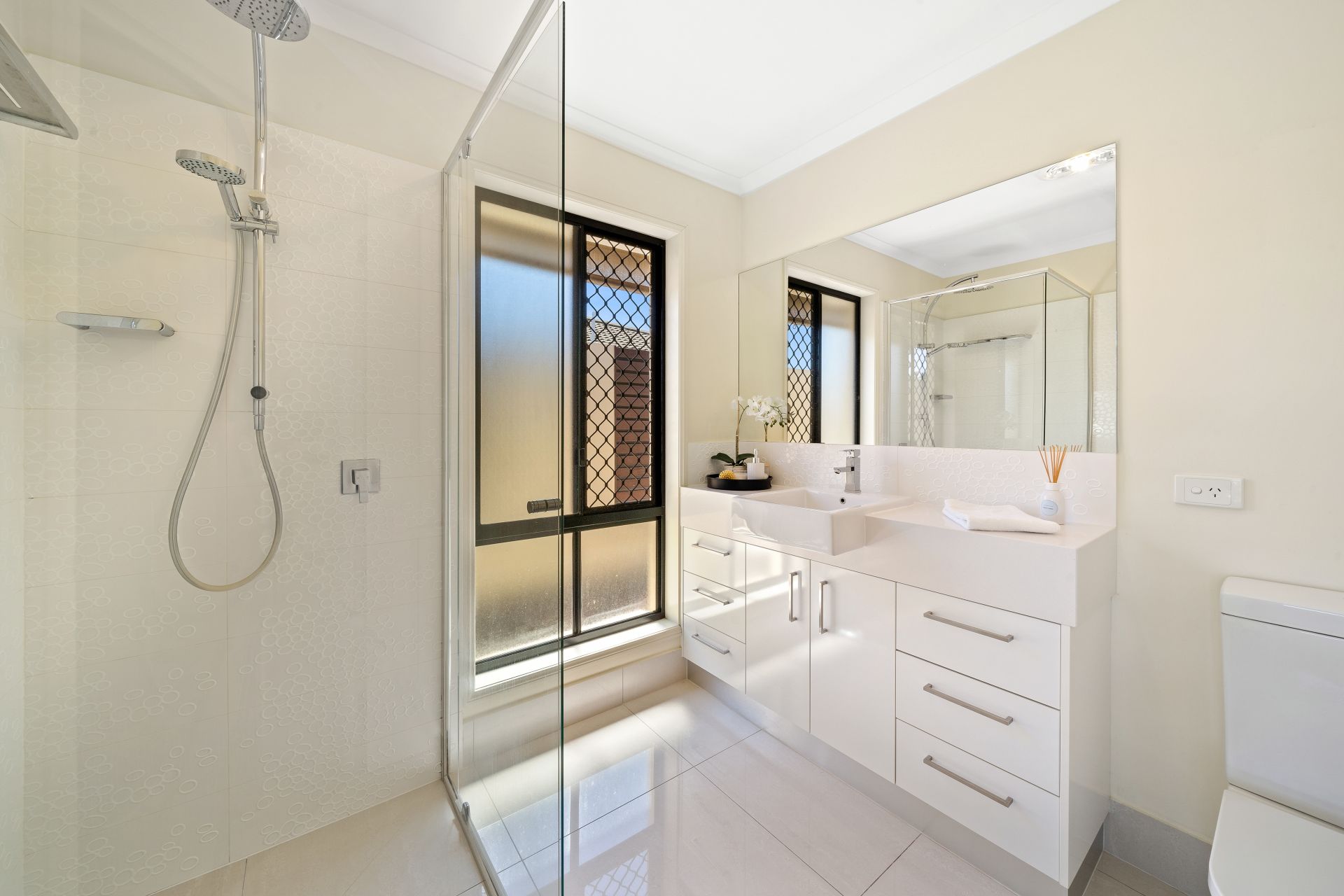 > The ensuite bathroom features a raindrop showerhead with detachable head, single basin vanity with plenty of storage, large framed vanity mirror, extractor/heat/light combo, towel rack + hook, sliding frosted window and toilet.