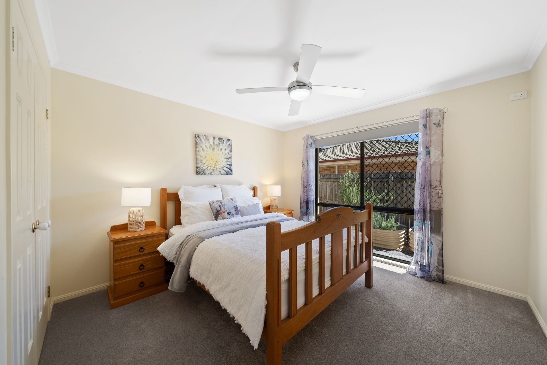 > The king size second bedroom offers built-in-robes, plush carpet flooring, ceiling fan with built-in light, sliding windows with a combination of roller + sheer curtains blinds, security screens and external retractable privacy shutters.