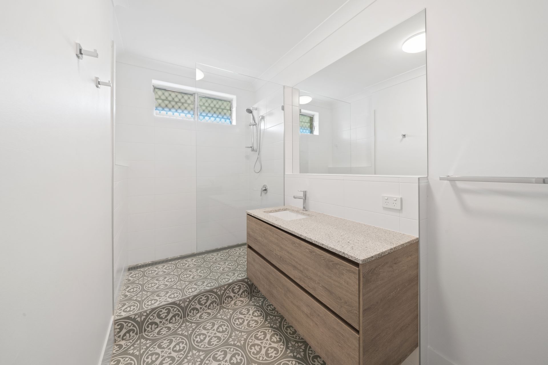 - Bathroom is one of kind with the same luxe designer tiles from the kitchen a larger wall-hung vanity with storage and a stone benchtop and mirror. Inside the walk-in frameless shower, the hand-held shower rose a large mirror ad