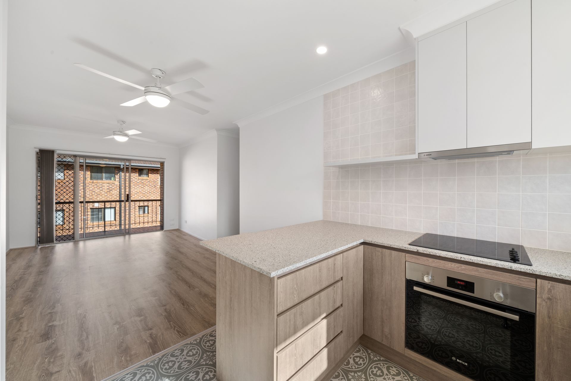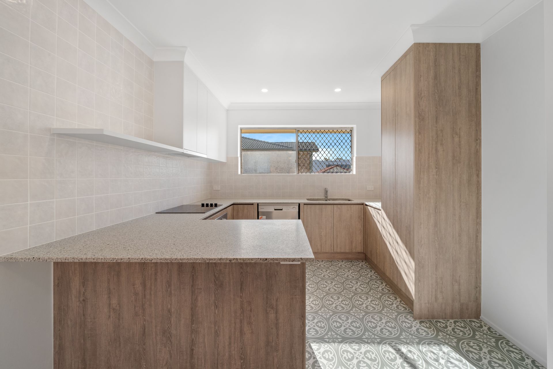 Beautifully finished with stone benches, wood-look cabinetry, dishwasher, bosch electric oven and cooktop, rangehood and lux designer tiles