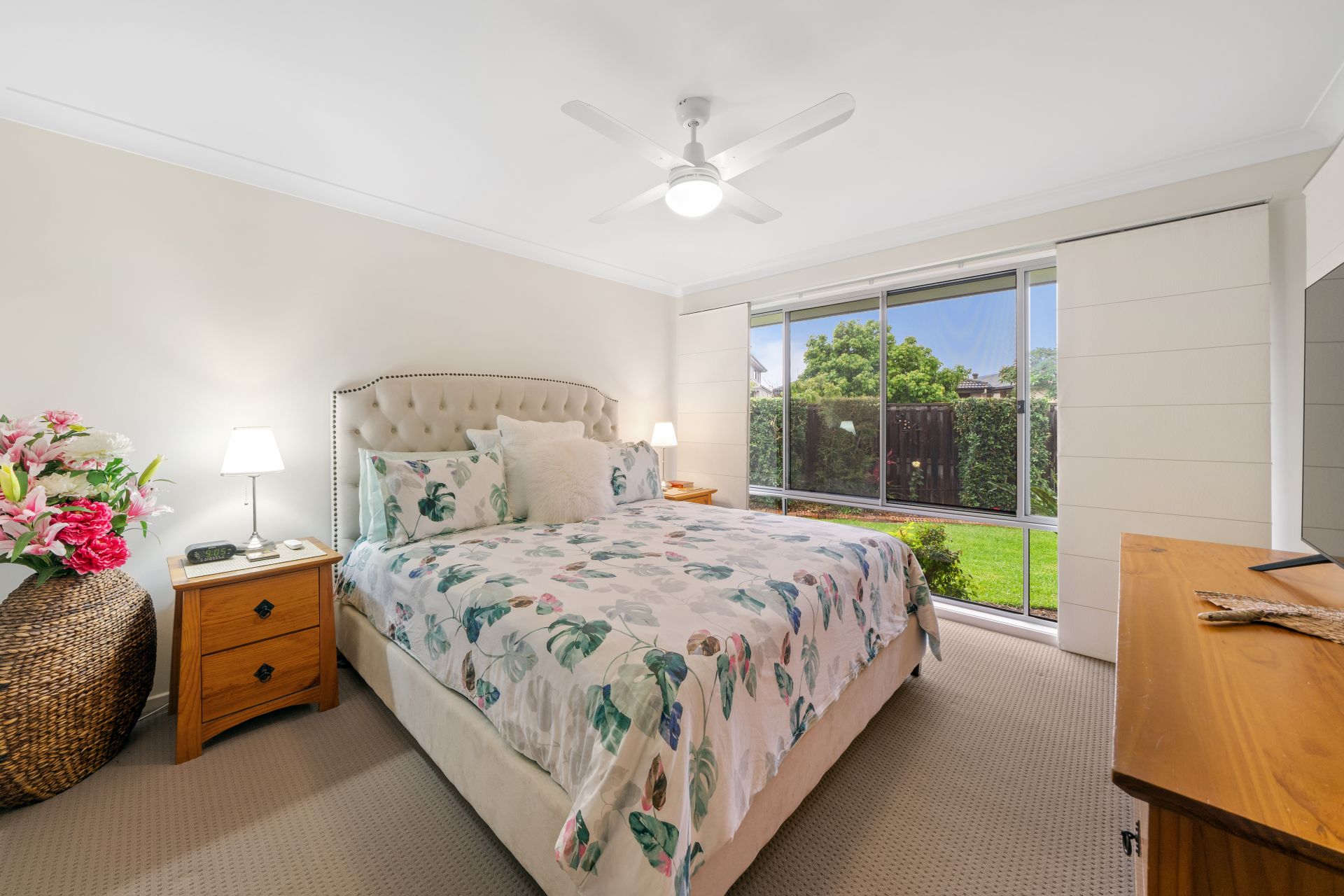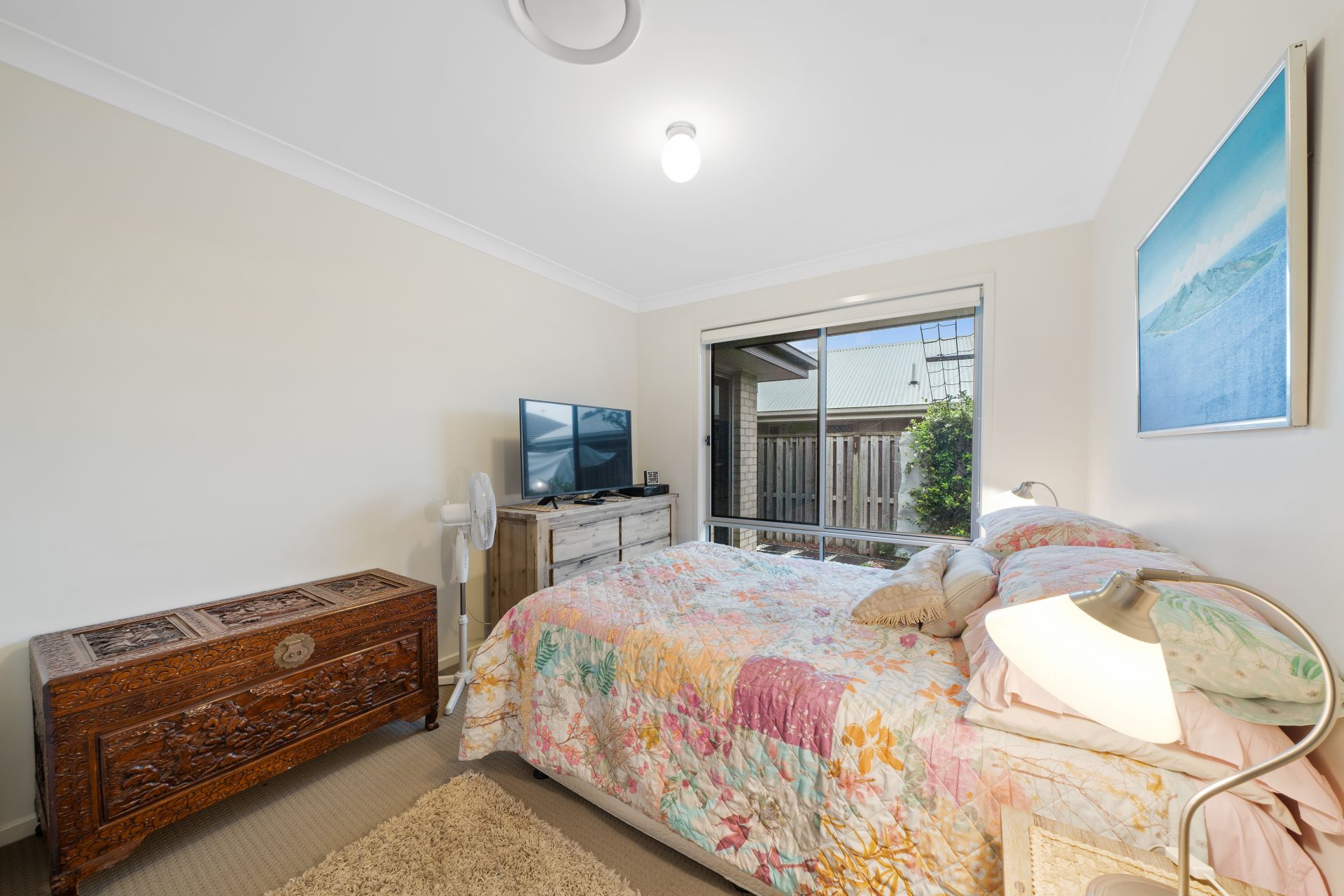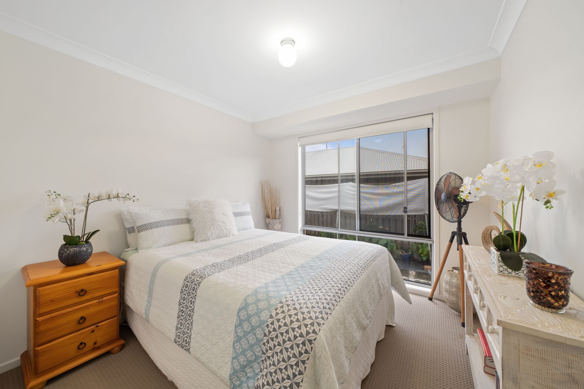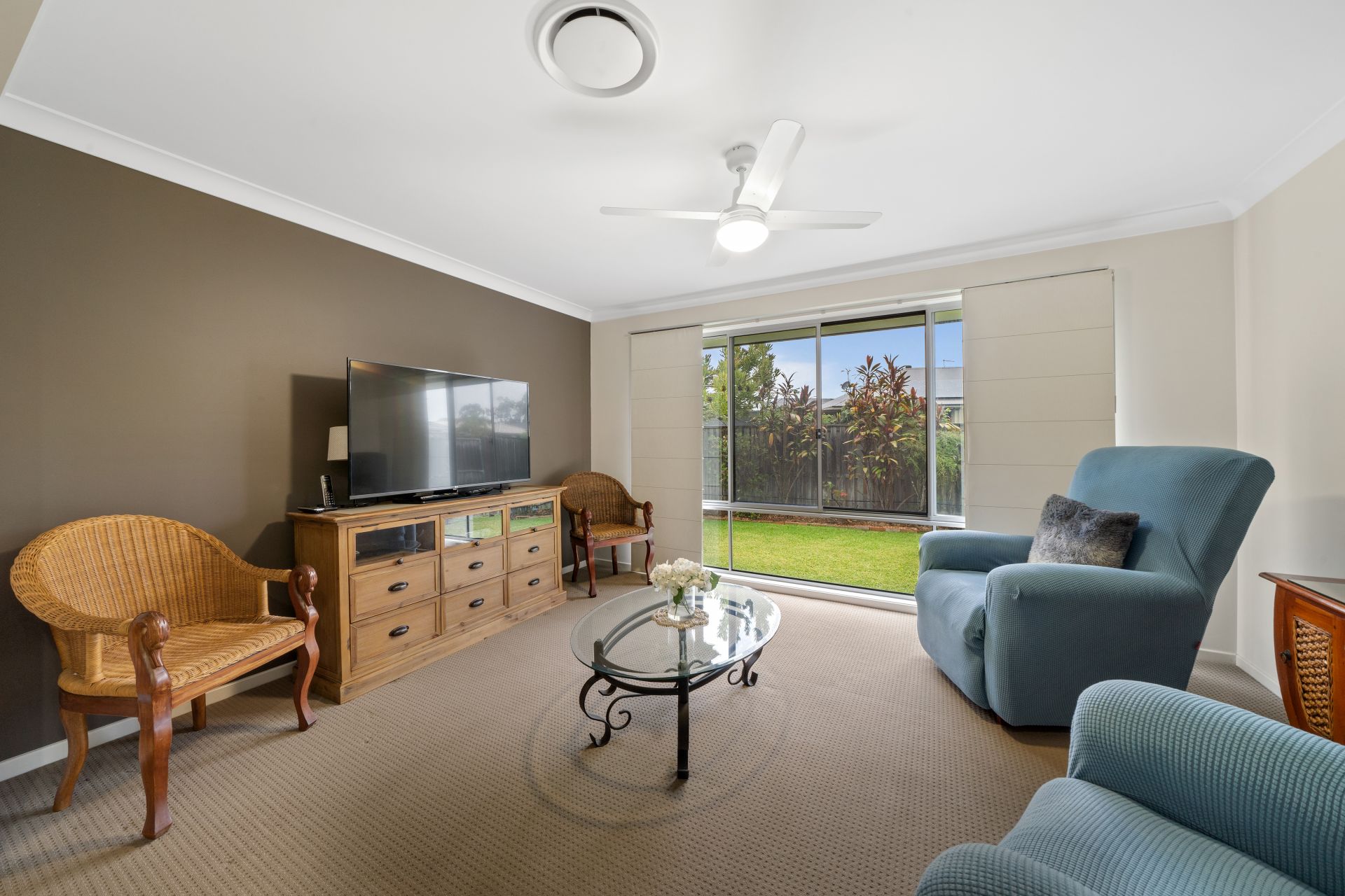 > The second living area features light/fan combo, carpet flooring, sliding windows with Crimsafe security screens and roman blinds.