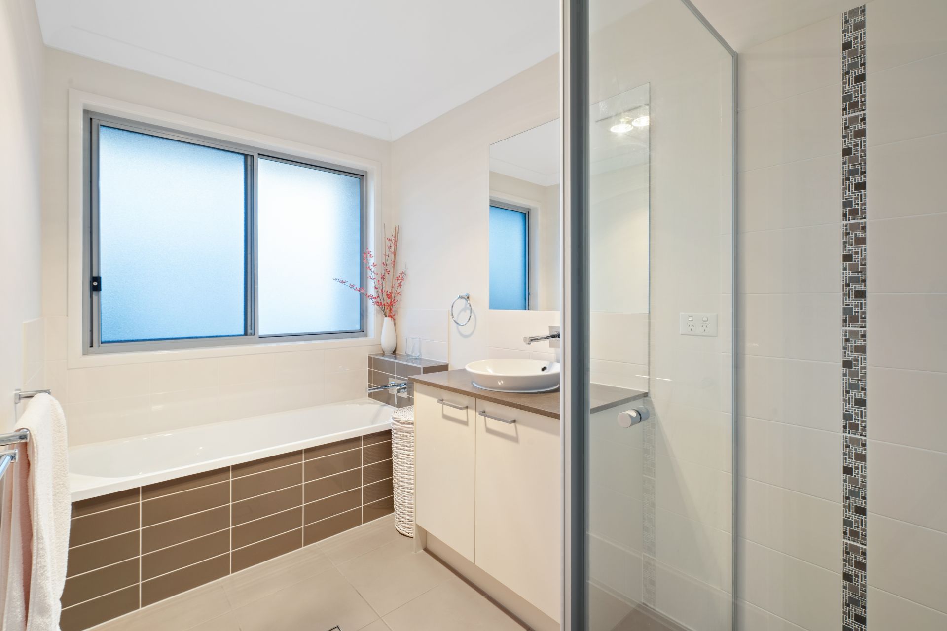 > The main bathroom offers single basin vanity with storage, frameless wall mounted vanity mirror, bathtub, shower with detachable showerhead, light/heater/extractor combo, towel rails and hand towel hook, sliding window with frosted privacy glass and separate toilet.