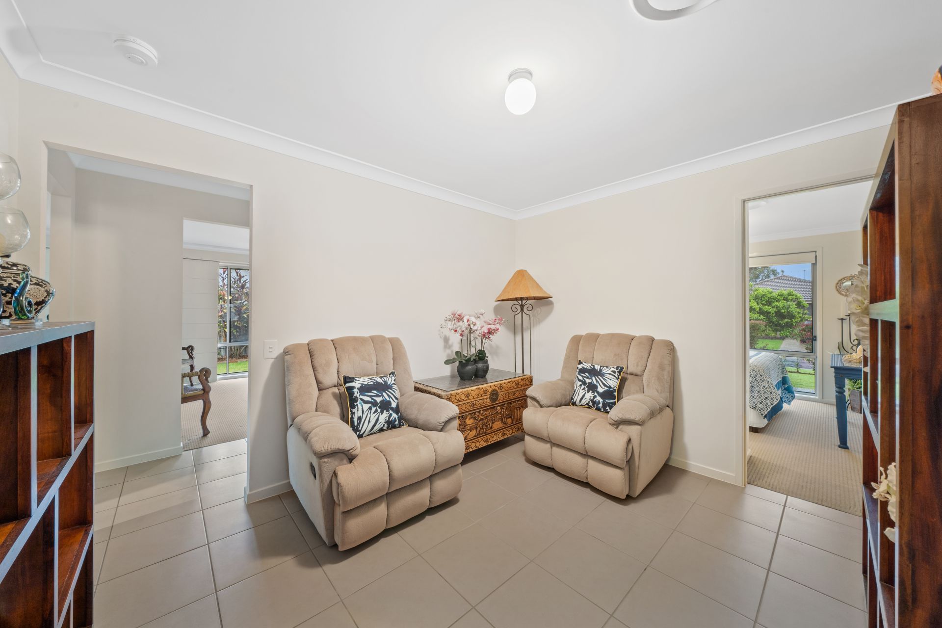 > The third living area with direct access to garage features tiled flooring and standard globe lighting.