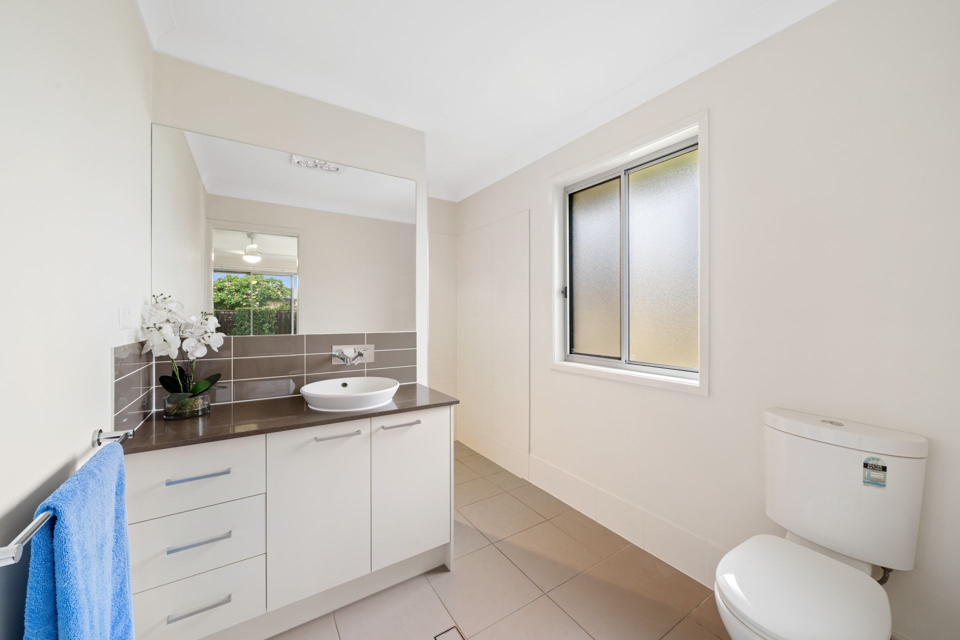 > The ensuite bathroom to the master offers single basin vanity with plenty of storage, frameless wall mounted vanity mirror, shower with detachable showerhead, light/heater/extractor combo, two towel rails, toilet, sliding window with Crimsafe security screen and frosted privacy glass.