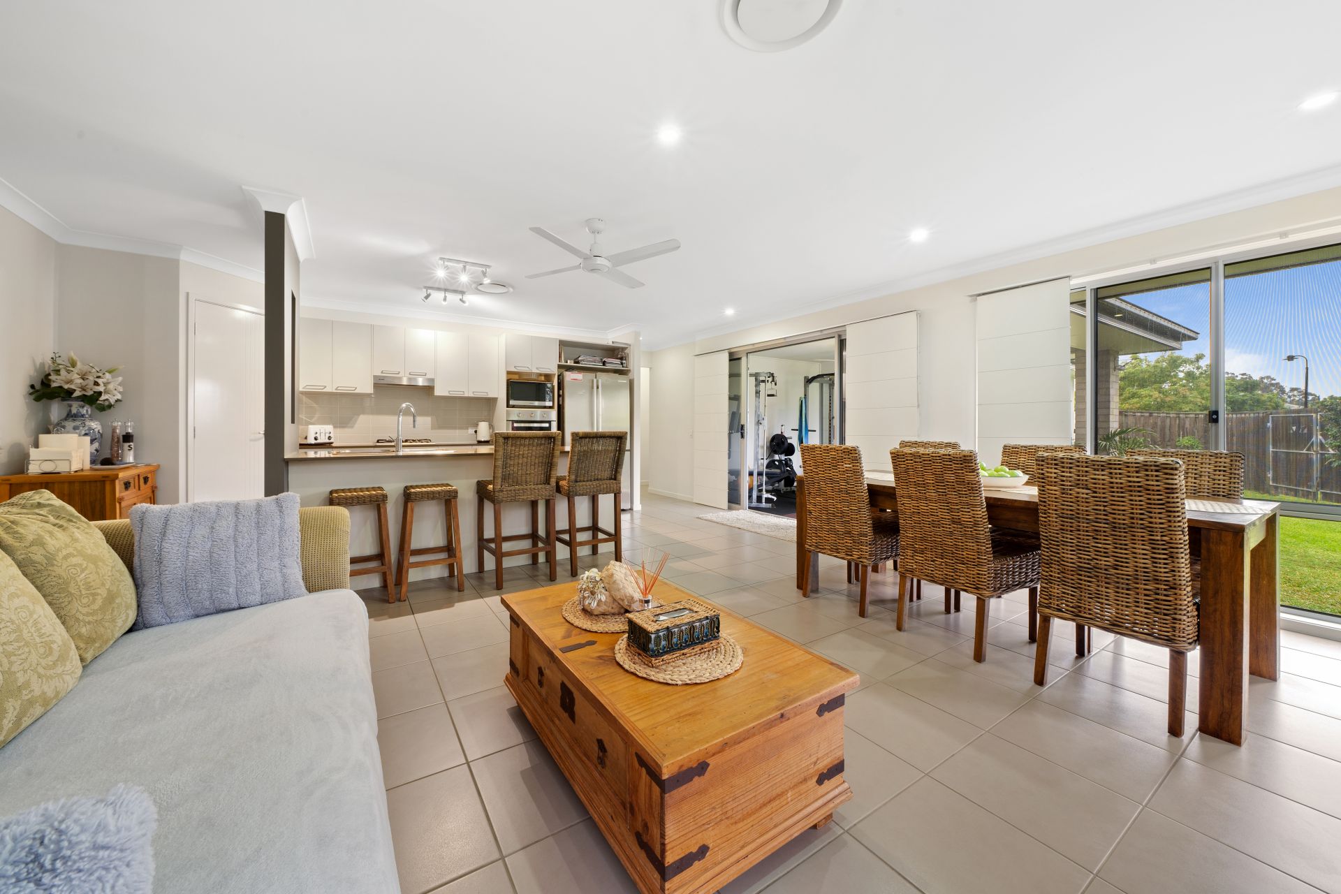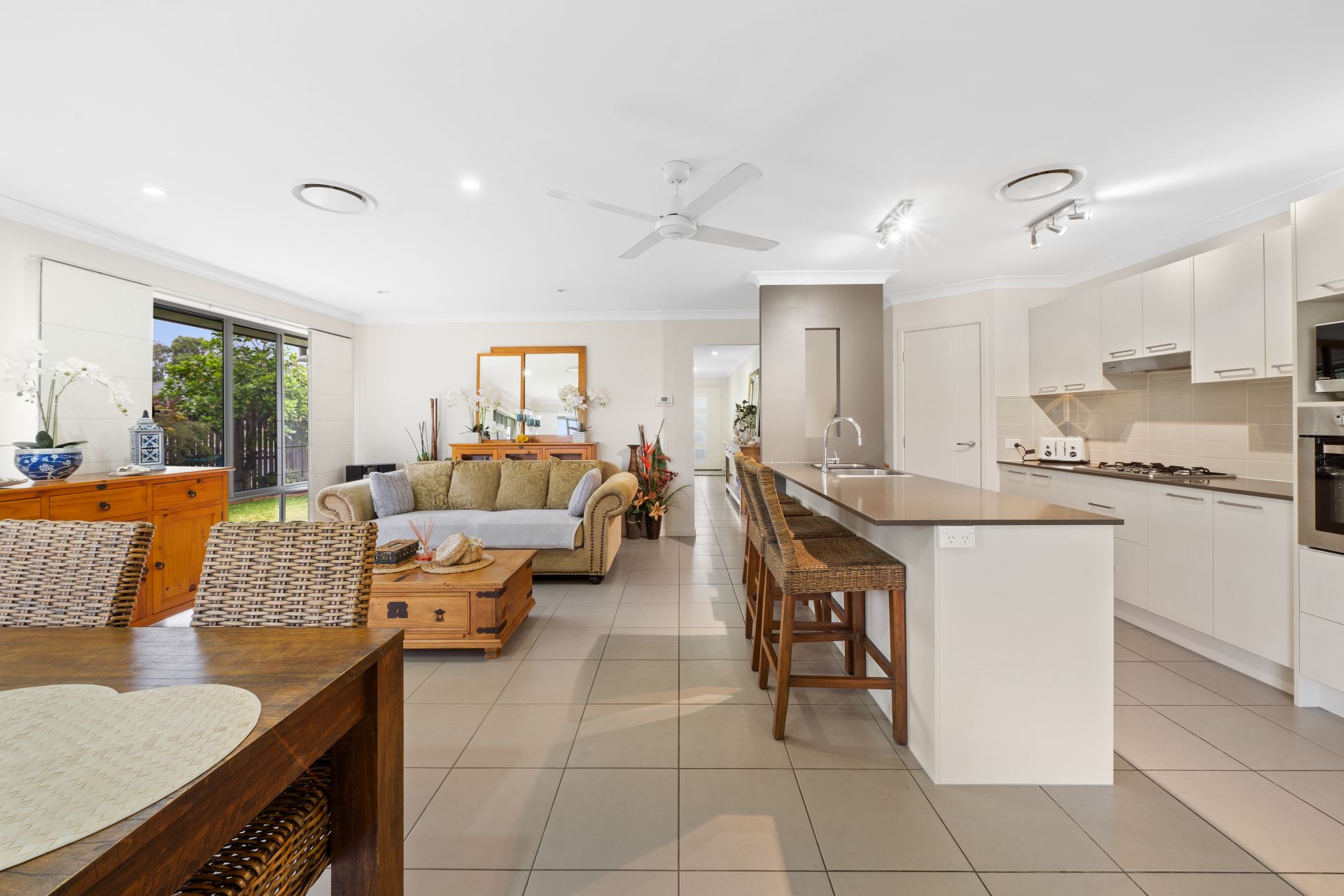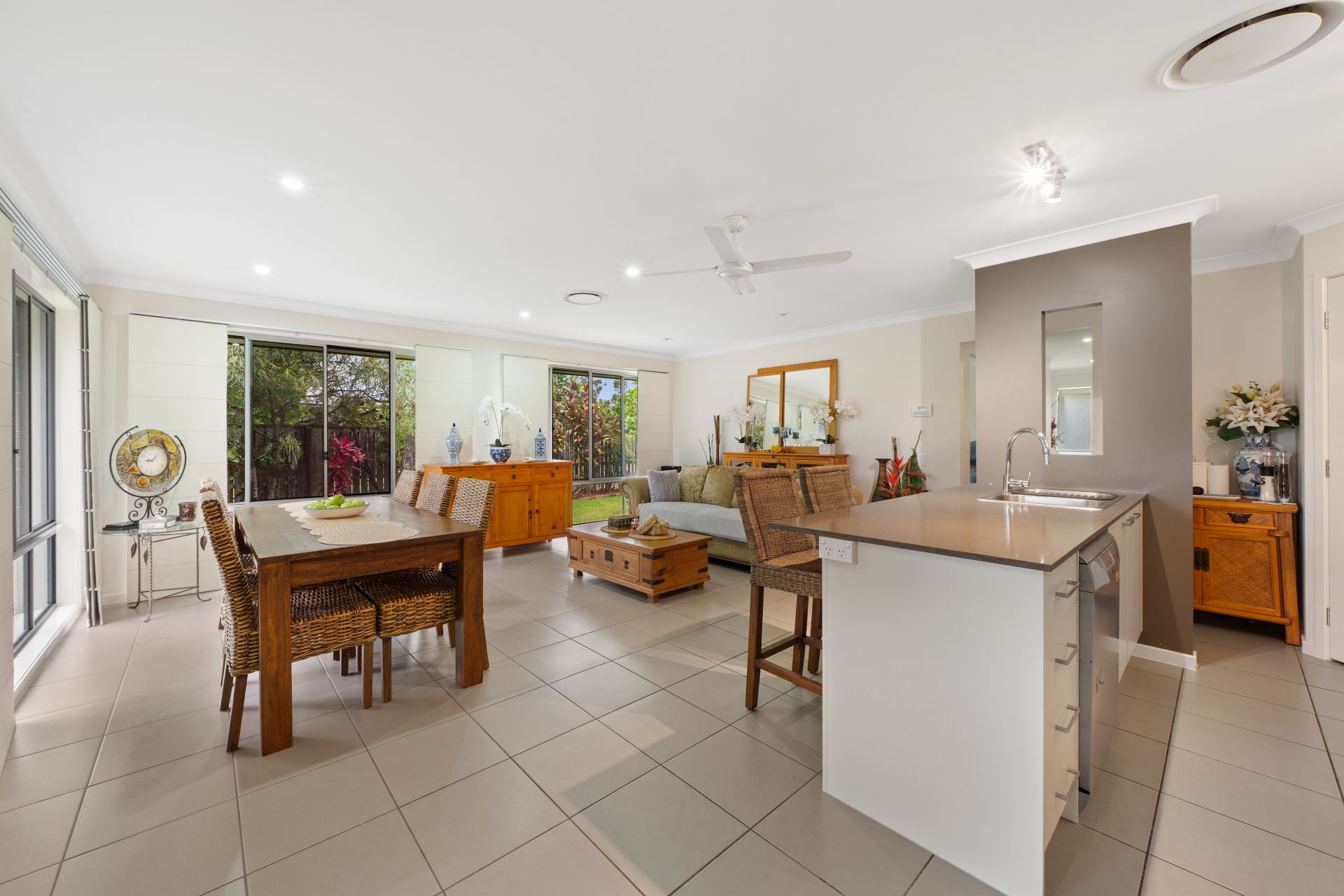> The open plan living and dining areas situated at the heart of the home flow effortlessly to the kitchen and out to the covered outdoor entertainment area. Featuring ceiling fan, tiled flooring, security screens, combination of sliding windows and sliding doors with Crimsafe security screens, roman blinds, and standard lighting throughout.